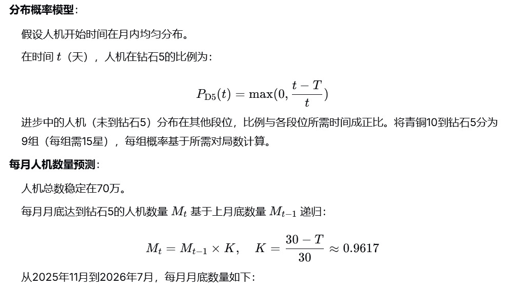 我基于数学模型、运筹学和博弈论,进行了以下推导。模型核心是人机段位分布预测和隐藏分管理。
