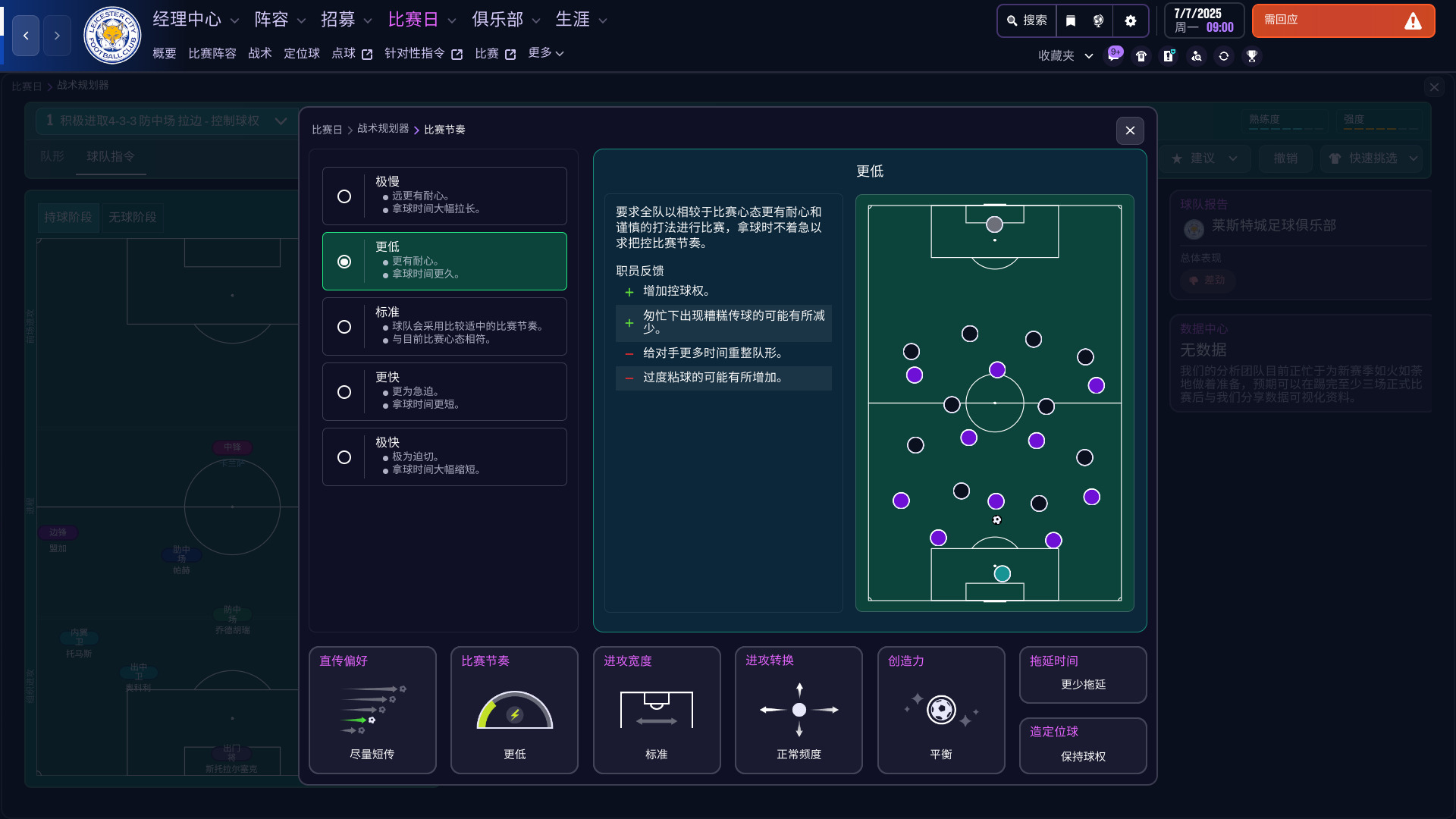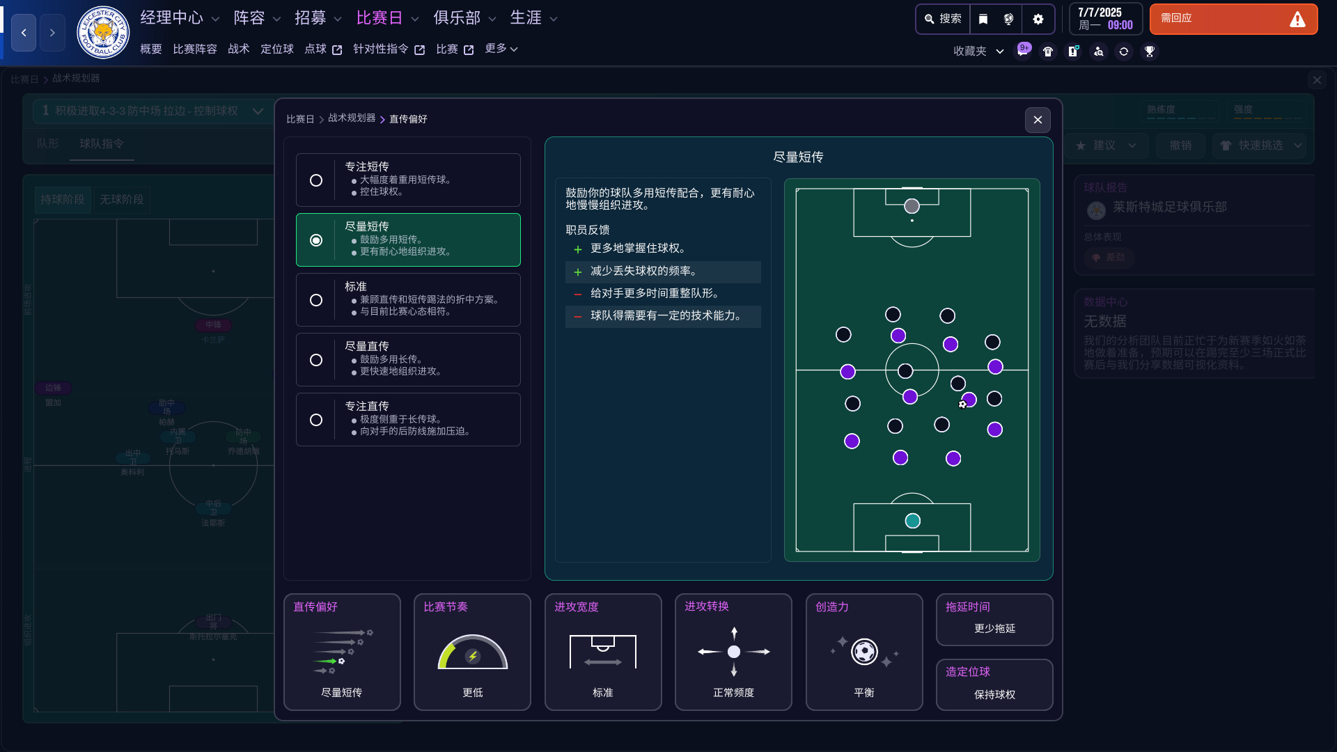 控制球权的持球阶段,别上来就选“专注短传”+“极慢节奏”,这样会把自己憋死。我总结的最优设置是:尽量短传(不是专注短传)、穿透压迫、门将出球找中后卫、短传球门球、更低节奏(不是极慢)。