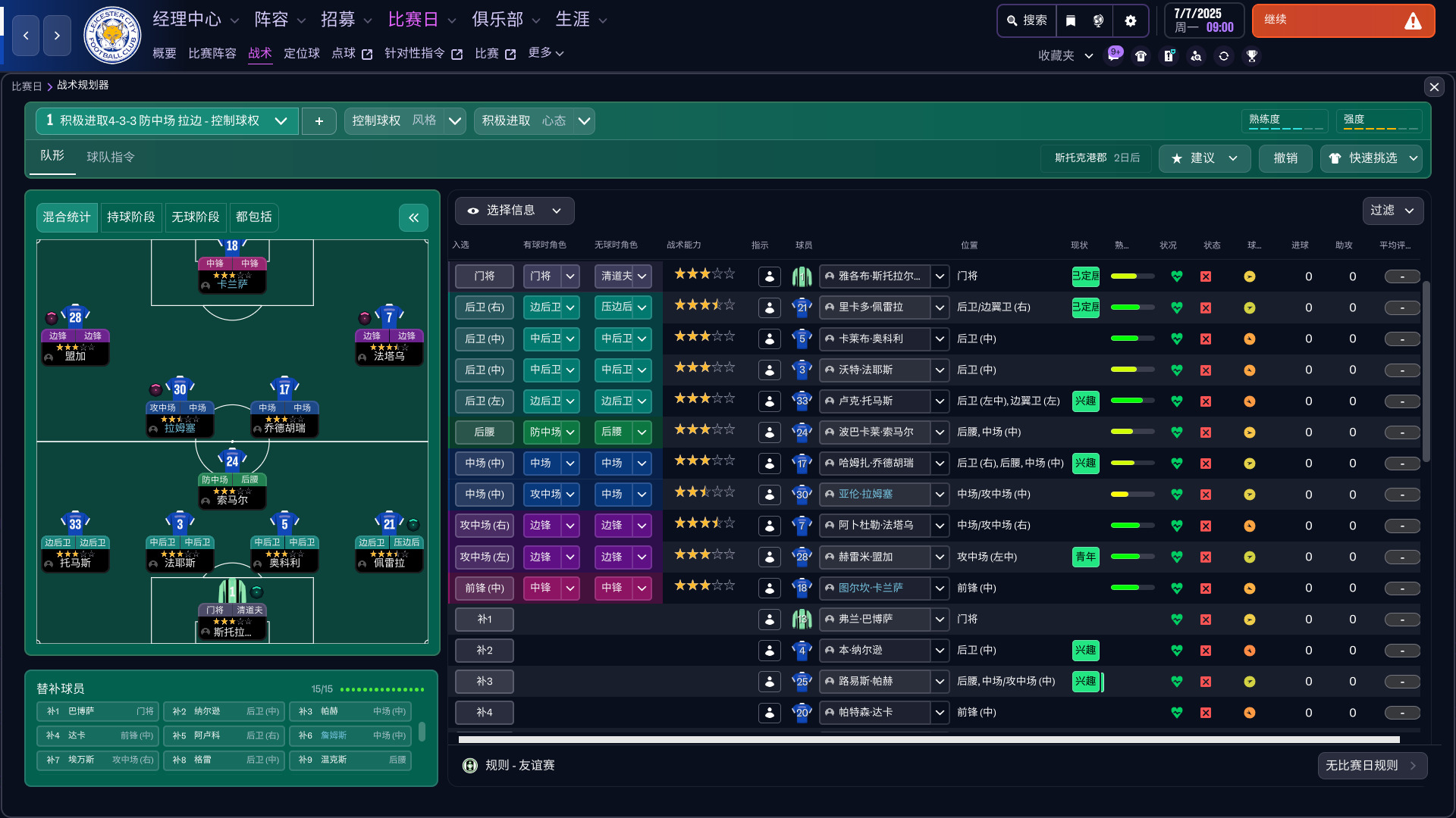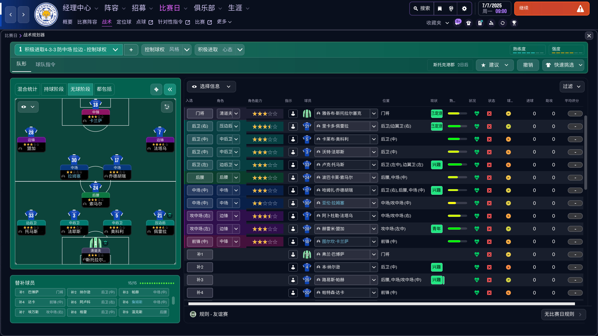 - 后腰:拖后组织核心(后腰拉开)。绝对核心,负责横向调度和稳定节奏,属性必须顶:传球16+、视野15+、决断15+、防守站位14+。我用的是从本菲卡租来的路易斯,他能在对手逼抢下冷静出球,还能偶尔前插远射。注意:别让他承担太多防守任务,设置“小心谨慎”,避免他上去回不来。