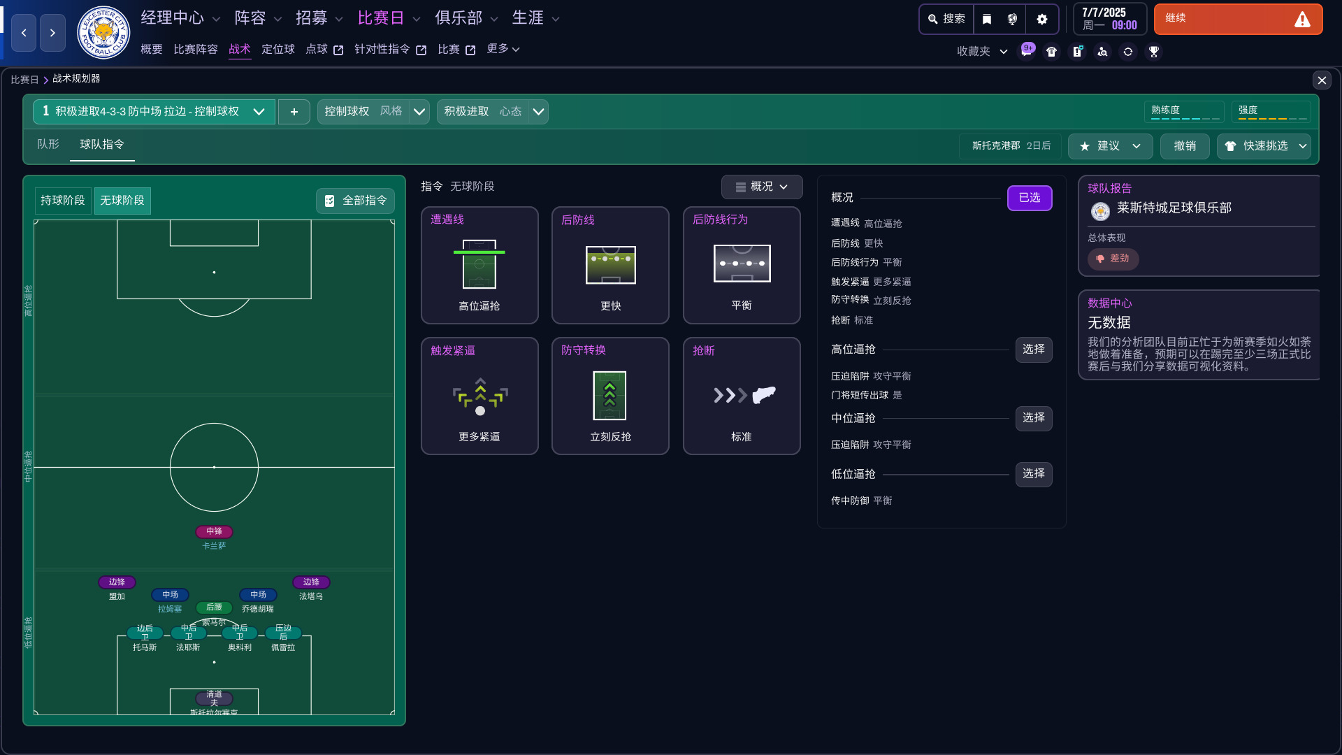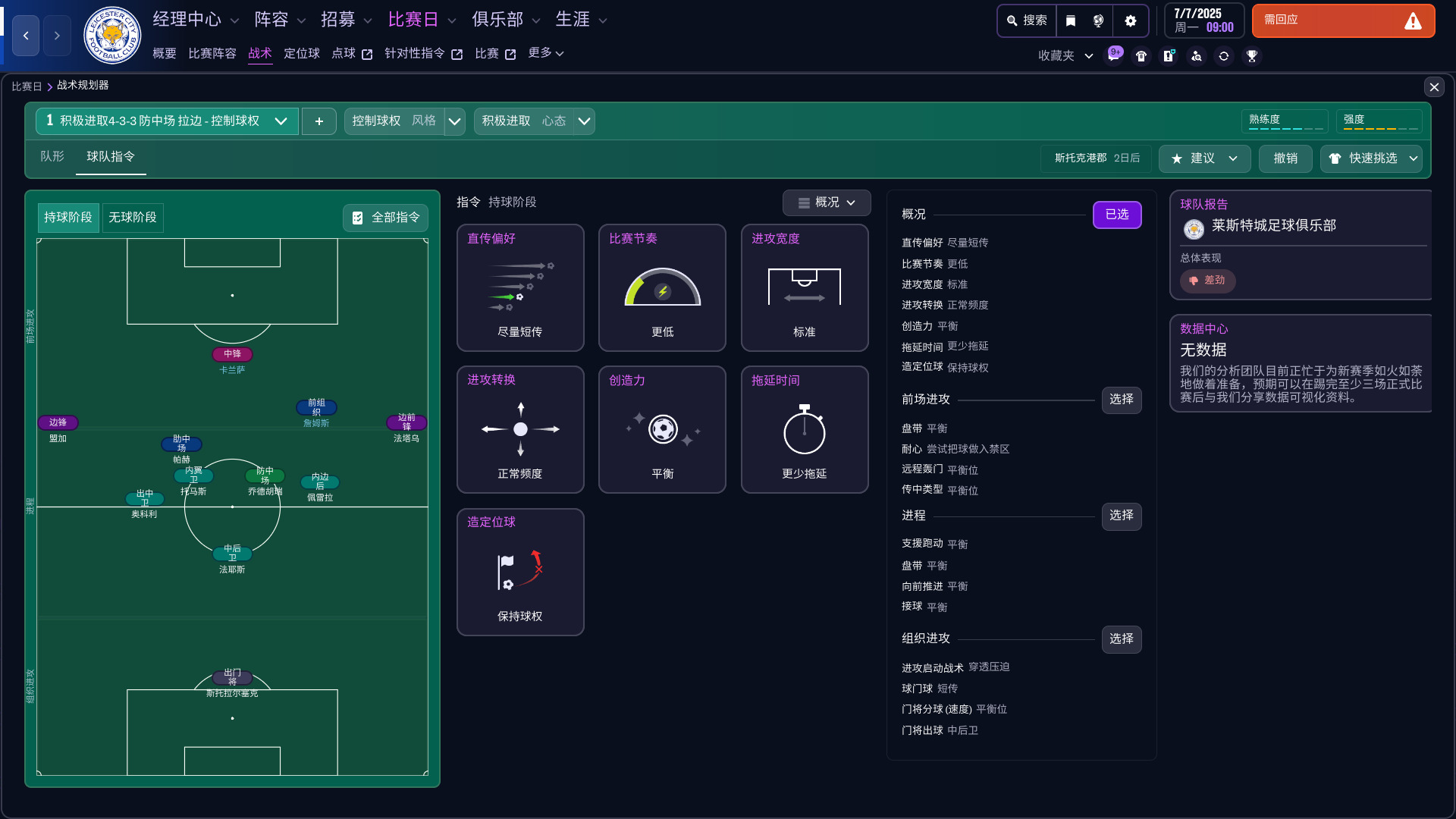 玩《足球经理26》打传控,很多人会陷入“只控不攻”的误区——控球率70%以上却赢不了球,要么被反击偷一个,要么门前终结拉胯。其实问题不在“控制球权”这个风格本身,而在阵型搭配和细节设置没跟上。我用这个4-3-3(后腰拉开)+控制球权的组合,带莱斯特城从英冠冲到英超前四,甚至赢过曼城、阿森纳,核心就是把“控球”从“目的”变成“手段”,用传球调动对手,最终找到致命空当。