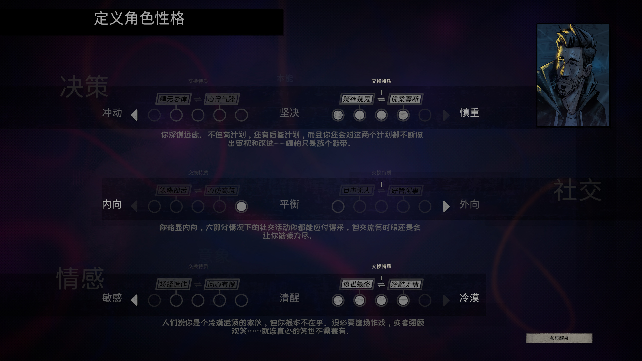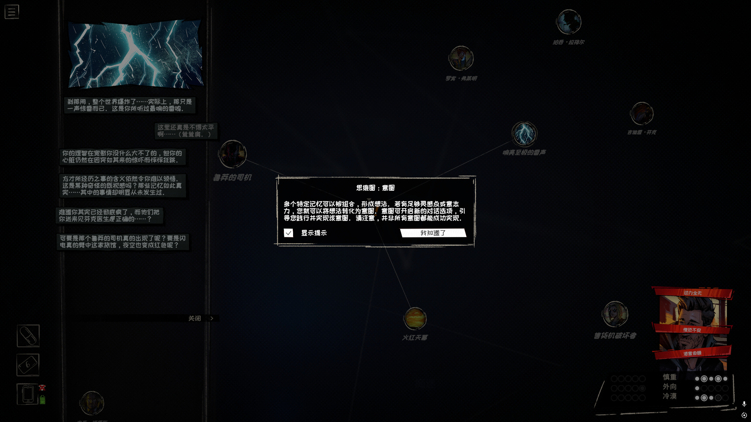 主角在玩家的操纵下,时不时会与自己的内心进行对话,某些情境下也会触发属性判定。我蛮喜欢这款游戏属性判定时的动画演示,目前还没有搞清楚判定动画的逻辑,但一不同挺好的,说明制作组已经厌倦了传统的骰子判定,并且决定做出新的改变与实验。在不断重复的循环中,主角会获得新的信息,触发灵感并形成新的意图。不同的意图会在对话中解锁额外选项,而角色初始阶段投入的属性点,也会影响部分对话分支的可用性。据已知信息而言,游戏进程中的选择虽然不会改变最终结局,但是会让这一趟旅程多一些属于玩家自己的变数。
