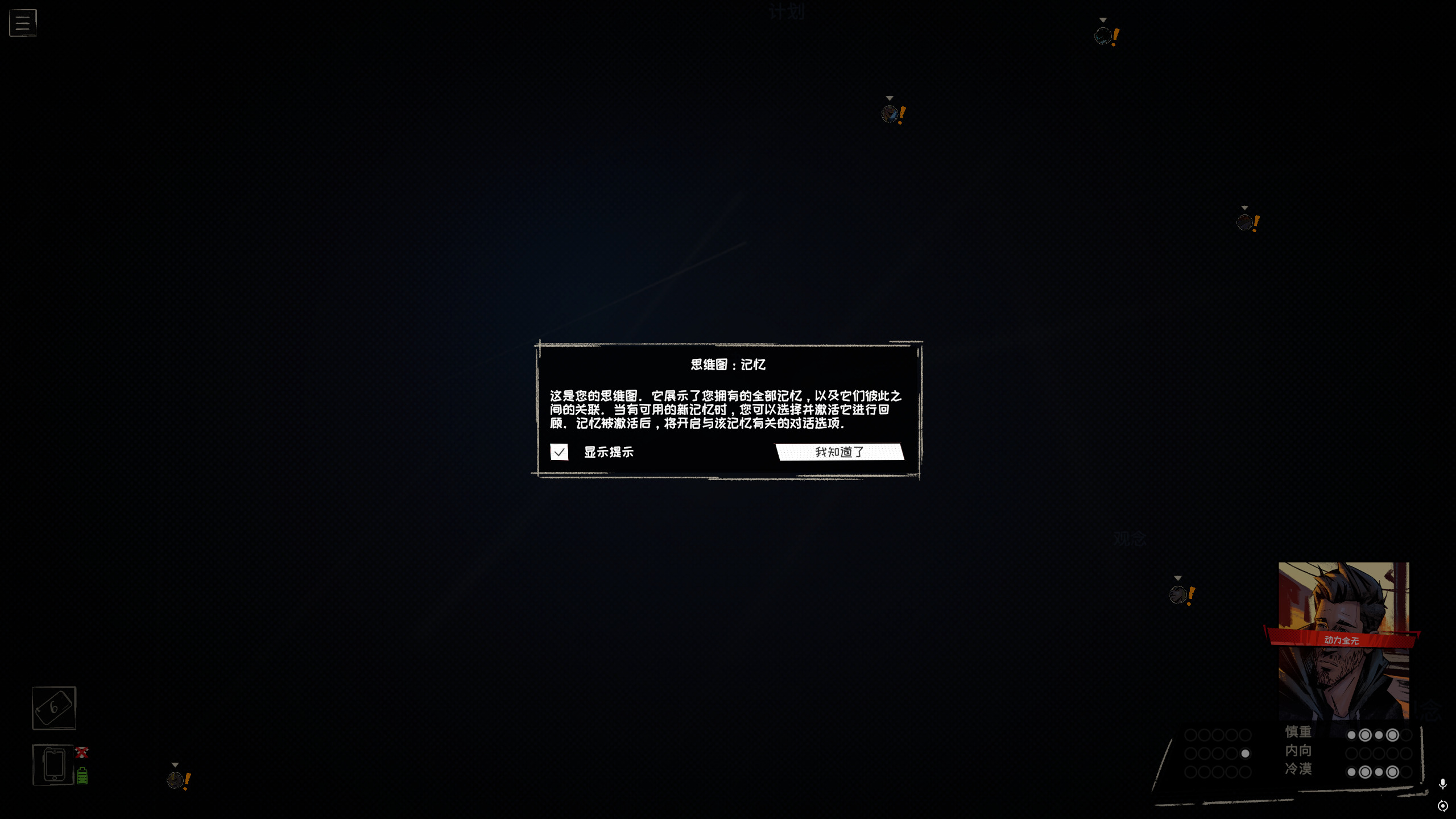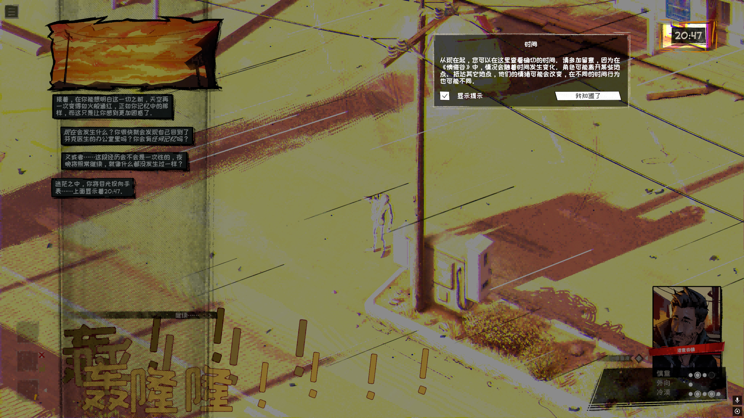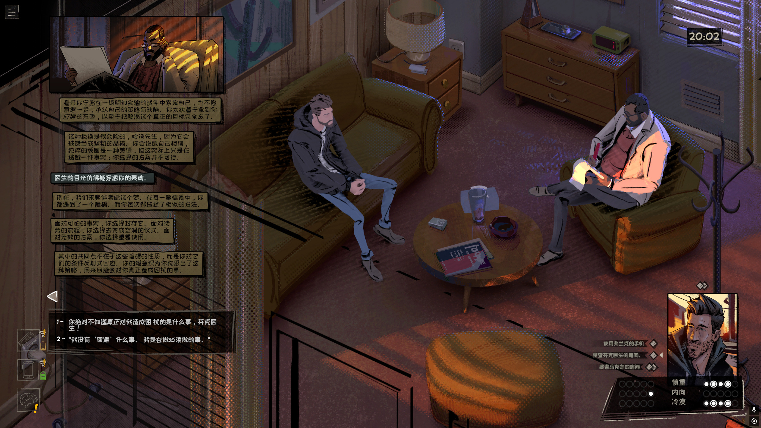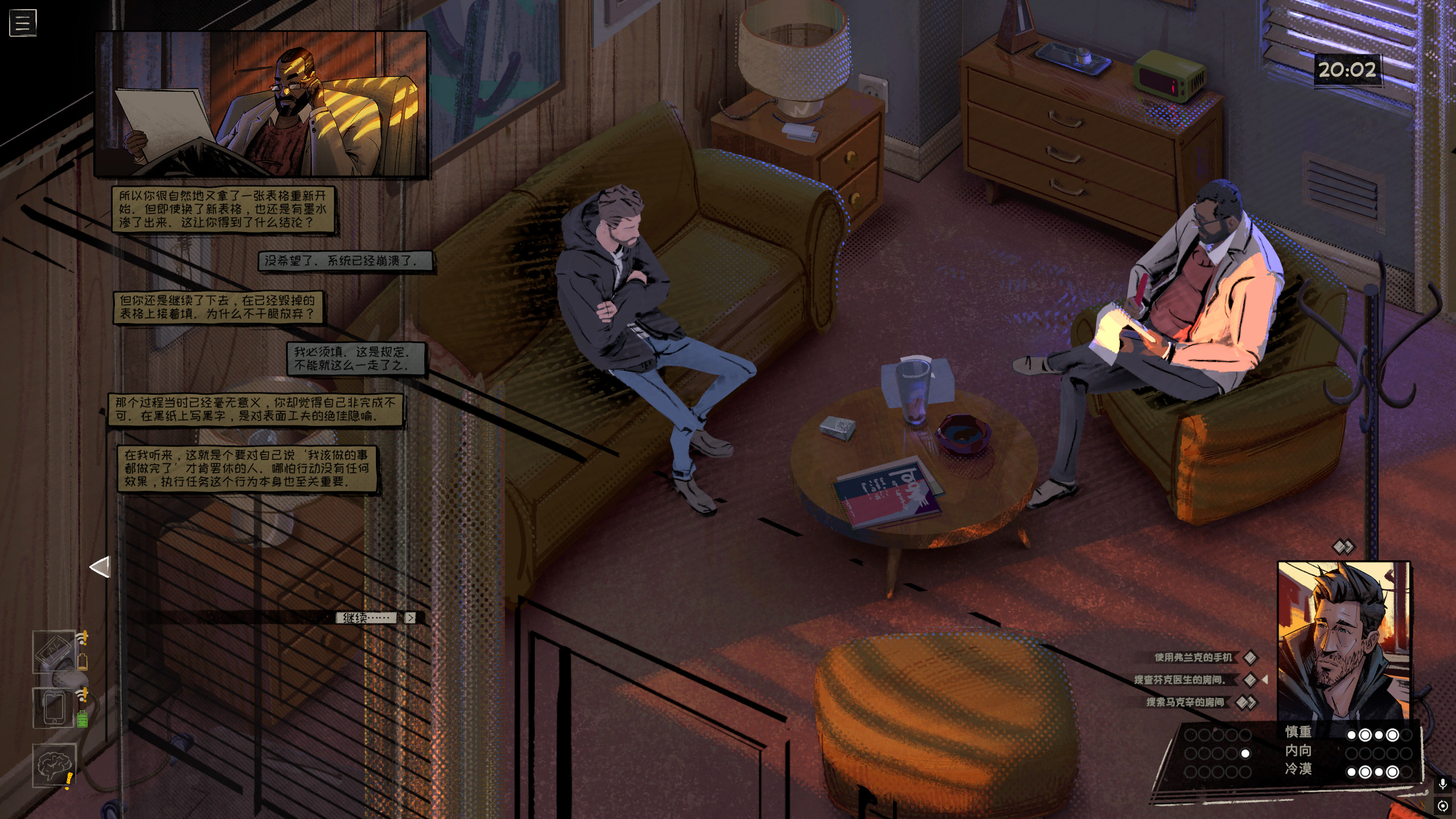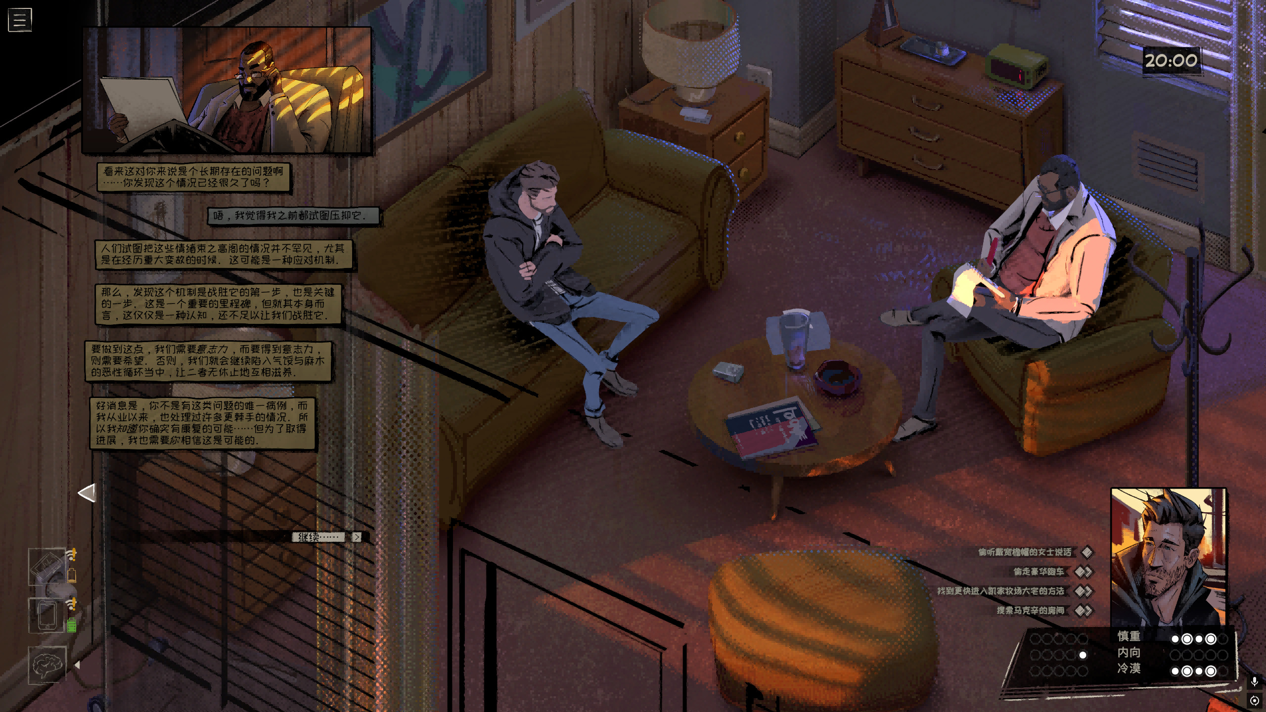 回到我们今天聚光灯下的主角,由 Emotion Spark Studio 开发、由 Owlcat Games 发行的《懊悔谷》。在阅读完简介之后我对其拥有过期待,期待在这种设定下故事的发展会给人带来的惊喜。游戏主要内容围绕着两个母题,时间循环与精神疾病。时间永远在20:00——20:47之间循环。男主角拥有玩家所未知的心理障碍,在多次循环过程中,心理医生以解读者身份出现。在这 47 分钟内,起初玩家可做的事情其实并不多,但随着循环,玩家将揭开各个事件背后的隐情,于是逐渐拥有一大堆事情可做。