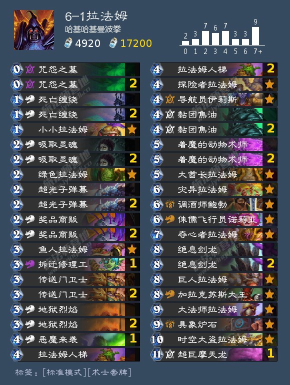 乱斗几乎全是任务术和任务战,这套卡组可以同时均势两套毒瘤。起手留1-4费拉法姆和动物术师对任务术起手找动物术师,乱斗的任务术没有冰激凌和双开门,伤害能力较弱,靠拉出大野兽拖到后期,一回合两只邪能野兽完全可以应对,耗干对方资源或反压踢死。对任务战则竞速拉法姆,争取在对方打出任务奖励,拿到开门水晶龙前拉法姆斩杀。