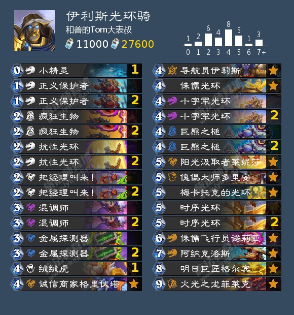 第一天15-5上传说,今天500名打到230。全程手机玩的没有炉石盒子之类的记录。本人娱乐玩家,很菜经常伏笔,所以更能证明卡组是有强度的。感觉目前新老卡组都能打,环境稳定后预测能有t2?希望有骑士爱好者大佬继续优化卡组。