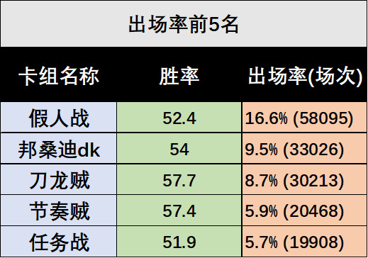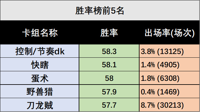 胜率方面,节奏dk、刀龙贼这两个出场率较高的卡组胜率也很高,节奏dk是无新卡的构筑,刀龙贼则是新出现的构筑