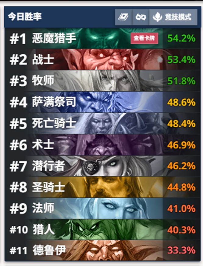 相较于前两天,术士热度降低,战、贼出场率大幅提升,战士大多为otk假人战,贼则以刀贼、节奏贼居多,dk的形态有两种,一种为新卡组邦桑迪dk,还有一种无新卡的节奏dk胜率也不错