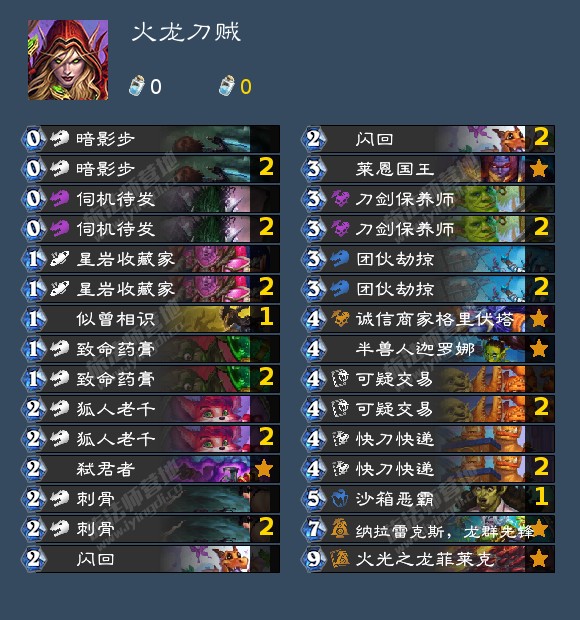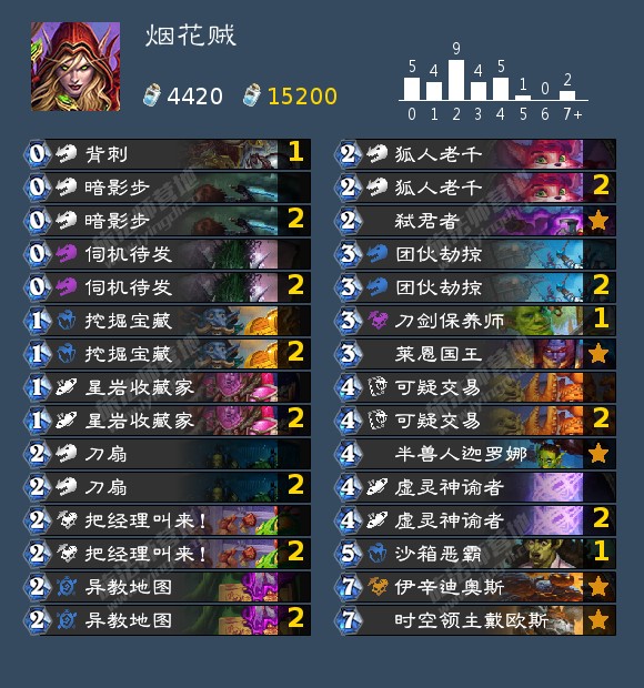 这套卡组是HDT上场次最多的烟花贼构筑,小编测试下来78把63%胜率。相较于火龙刀贼更加吃环境,优点是几乎稳吃战士DK等慢速,缺点是快攻抗性非常差,打术士猎人萨满胜率极低。