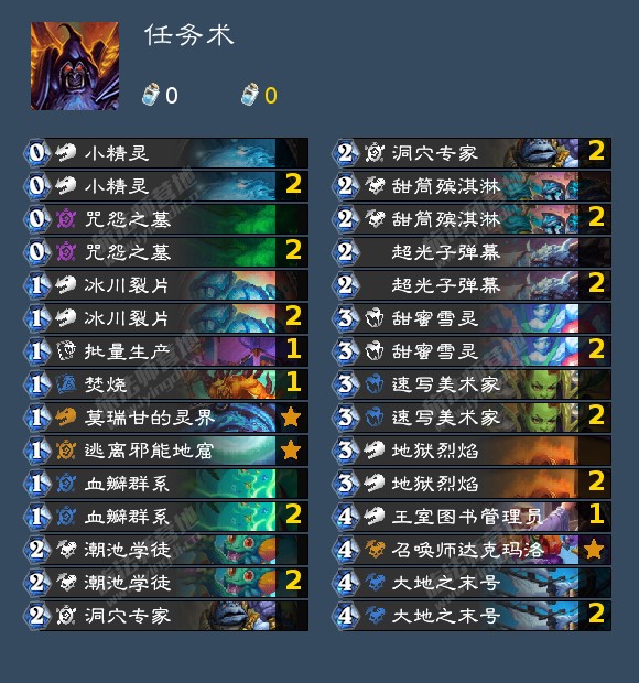 逃离邪能地窟、莫瑞干的灵界、血瓣群系、咒怨之墓,没有血瓣的时候留洞穴专家,没有灵界时可以留速写美术家。面对蛋术可以直接留王室图书管理员。其实任务术的留牌思路就是以自己任务优先,基本上不会出现一些较大的问题,但在费用规划上,任务术想打的非常完美却很难,在最近的比赛中众多选手的任务术总是打的不尽人意。