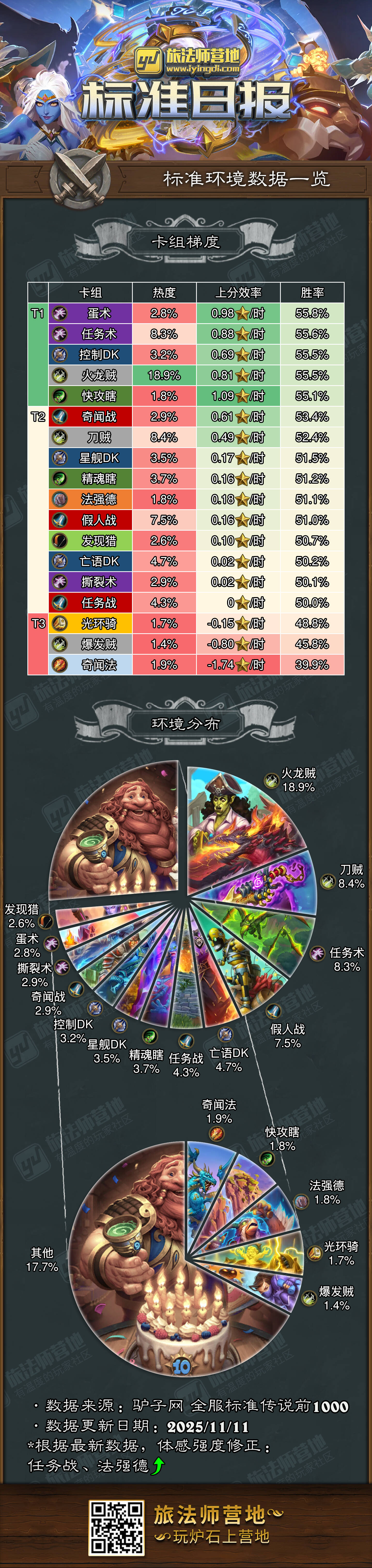 火龙贼(18.9%)、刀贼(8.4%)、任务术(8.3%)、假人战(7.5%)、亡语DK(4.7%)、任务战(4.3%)、精魂瞎(3.7%)、星舰DK(3.5%)、控制DK(3.2%)、奇闻战(2.9%)、撕裂术(2.9%)、蛋术(2.8%)、发现猎(2。6%)、奇闻法(1.9%)、快攻瞎(1.8%)、法强德(1.8%)、光环骑(1.7%)、爆发贼(1.4%)、 其他卡组(17.7%)