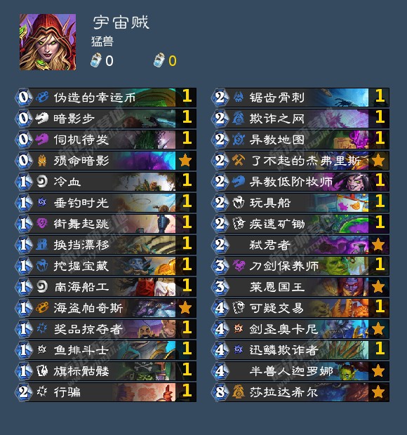 宇宙贼的强度比想象中还要高!相比起宇宙卡组,现在的宇宙贼更像一个节奏快攻。奇闻牌拥有优秀的压缩牌库能力和检索能力,在打一些橙卡较少的对手时,砍到莱恩国王的概率也是非常高的,在面对宇宙贼连续的压力时,对手很难额外花3费去清理上手的国王。烧树提供的质量不容小觑,同时宇宙贼拥有冲锋+5+5/冷血殒命后姐夫风怒的otk能力,经常使得对手猝不及防就被斩杀。就我体感来看,宇宙贼已经超越宇宙暗牧和宇宙猎,成为了现在强度最高的宇宙卡组。
