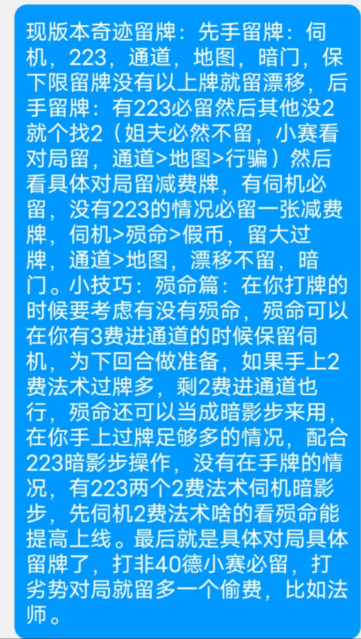 一切对局起手留深海来客,也可留芬利,德鲁伊默认星界德,贼默认宇宙贼,猎人默认宇宙猎,术士默认弃牌术,骑士默认元气骑,瞎子默认任务瞎,根据此原则考虑留解。