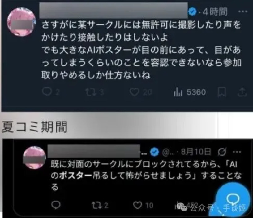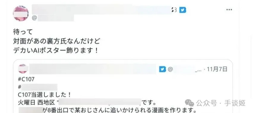 然而,日本C107在这次整的活,还是有点逆天了。来,先看VCR——这是本次事件的主角之一,是X平台上的一个AI使用者,曾经干过用AI海报跳脸拉黑ta的画师这种事情。