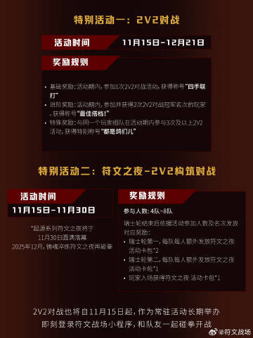 特别活动二:11月15日-11月30日,参与符文之夜-2V2构筑对战,即可赢得活动卡包。