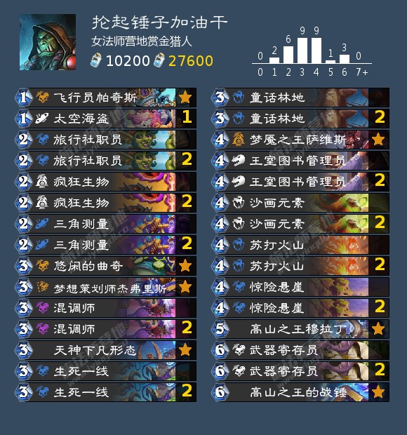 星灵法感觉像是个沙包...我们的伤害测试器。卡组里一张嘲讽都没有。鲍勃冻结,巨像清场拖回合也都没什么用,反正冻不了脸,抡起锤子继续框框干就行了。