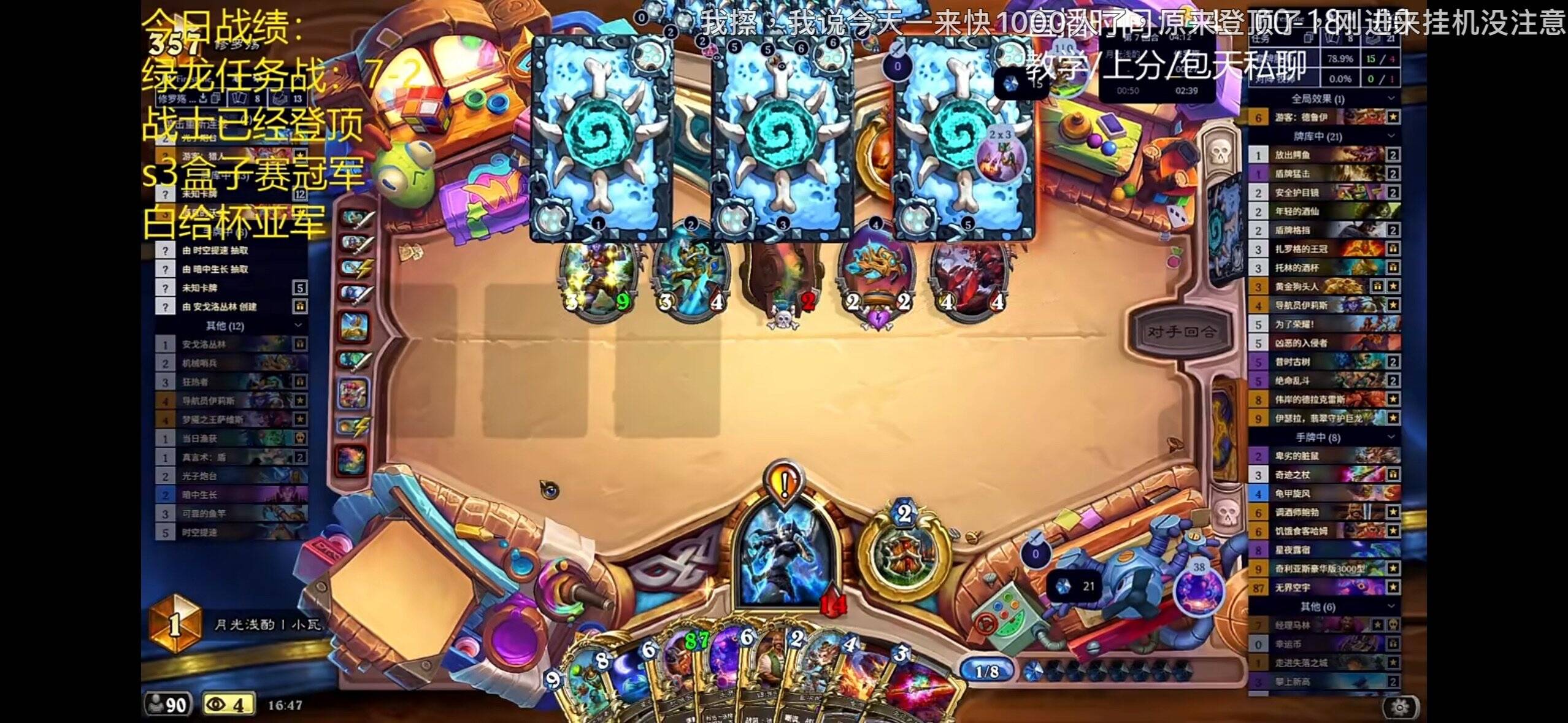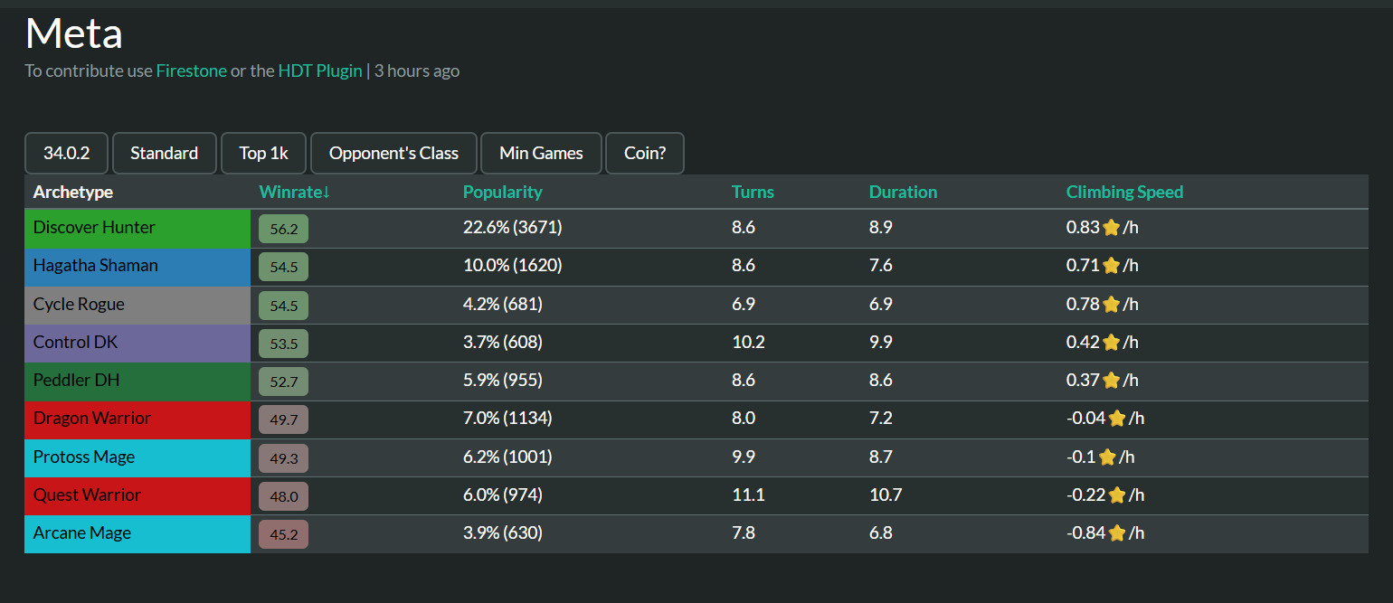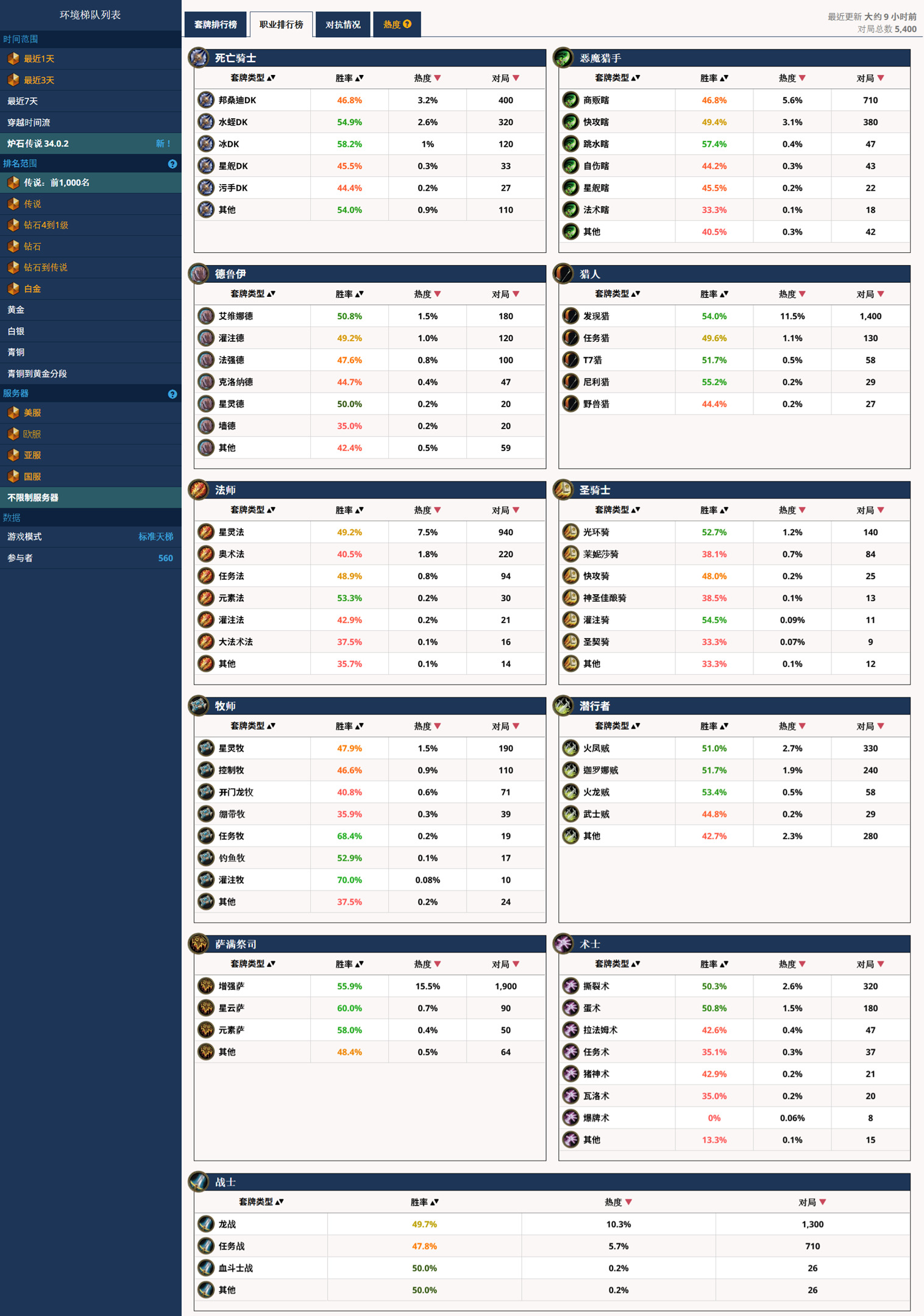 依序为: 发现猎 / 奇闻萨 / 火凤贼 / 控制DK / 精魂瞎 / 龙战 / 星灵法 / 任务战 / 奥术法(奇闻法)