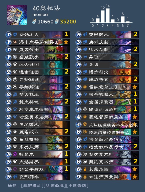 非一线卡组,会需要点熟练度和当前环境理解,奥秘法因为按斤叫削弱更加查无此人,上分还是推荐主流卡组,欢迎优化。
