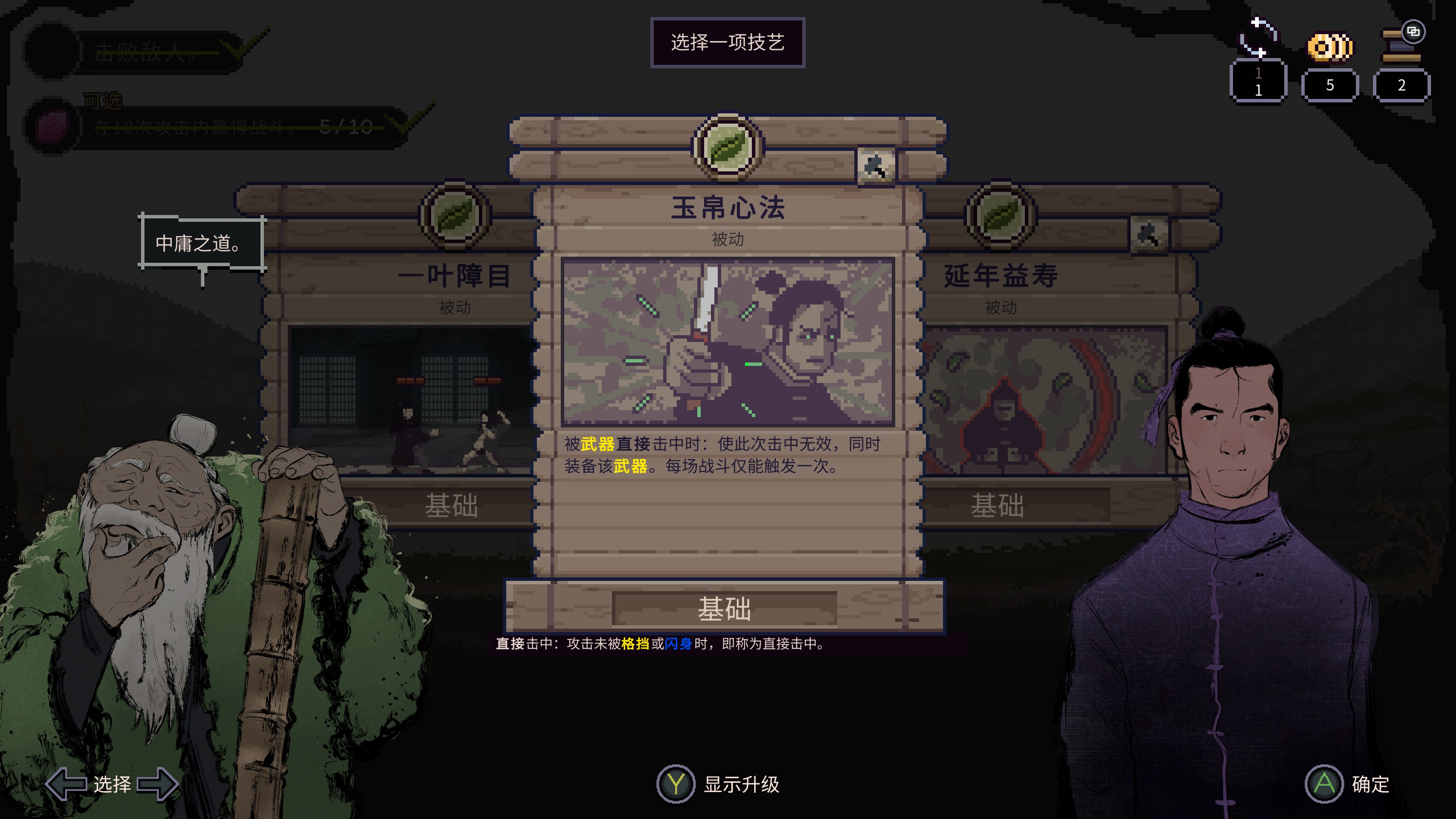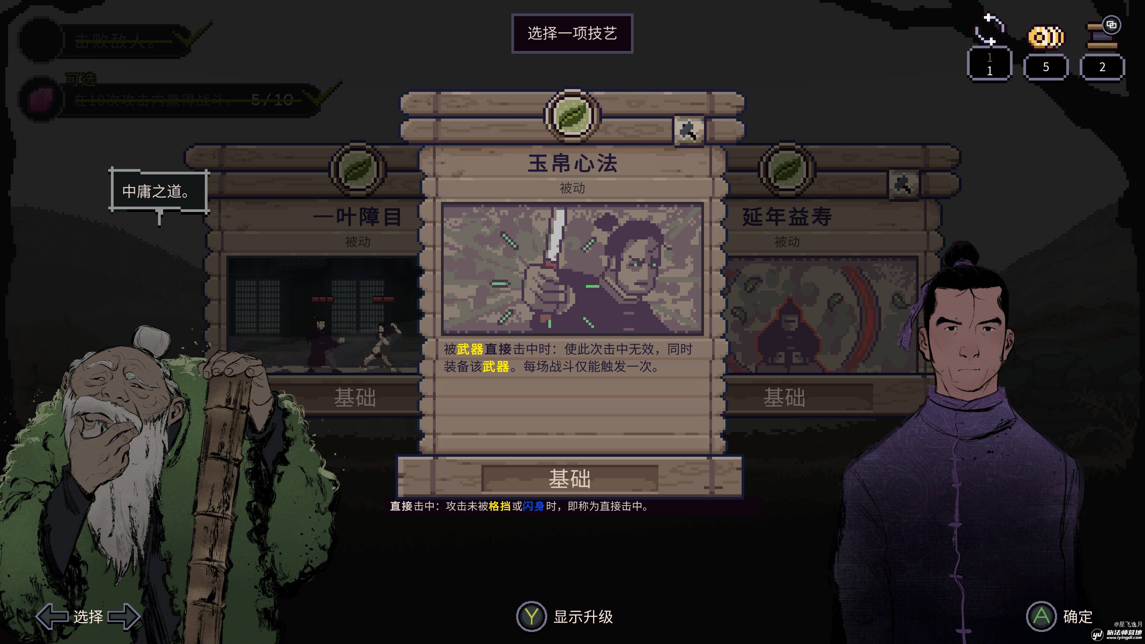 而在流派构筑方面,游戏也提供了5种风格各异的流派:以闪避和借力打力为主的飞叶派、以格挡防反见长的寒瞳派、以身法和破防为主的风暴派、招无定式的疯猴派、以跳跃和寻找破绽为主的猛虎派。每种流派的打法和化解攻击的思路都不相同,比如在敌人冲过来的时候,飞叶派可以利用闪身直接躲开,寒瞳派可以正面进行格挡。但发动闪身、格挡等技能需要消耗气力,每一场战斗中能发动的次数非常有限,一旦耗尽基本上只能用自己的血量来敌人的血量,而普通难度下我们只有3格血,想要通关就必须要精打细算,充分利用好每一次技能,减少血量的消耗也变得至关重要了。