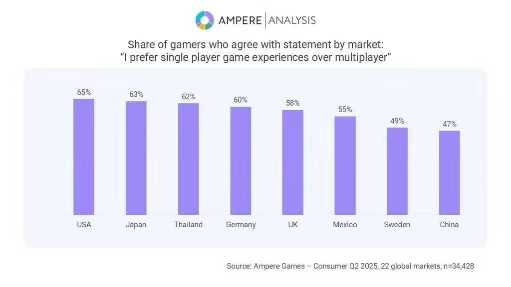 市场研究机构Ampere Analysis对22个市场的34,428名玩家展开调查,结果显示英国玩家中有58%更喜欢玩单人游戏;而在日本,该比例升至63%;在美国则升至65%。此外泰国(62%)、德国(60%)的受访者同样显示出对单人游戏的明显偏好。