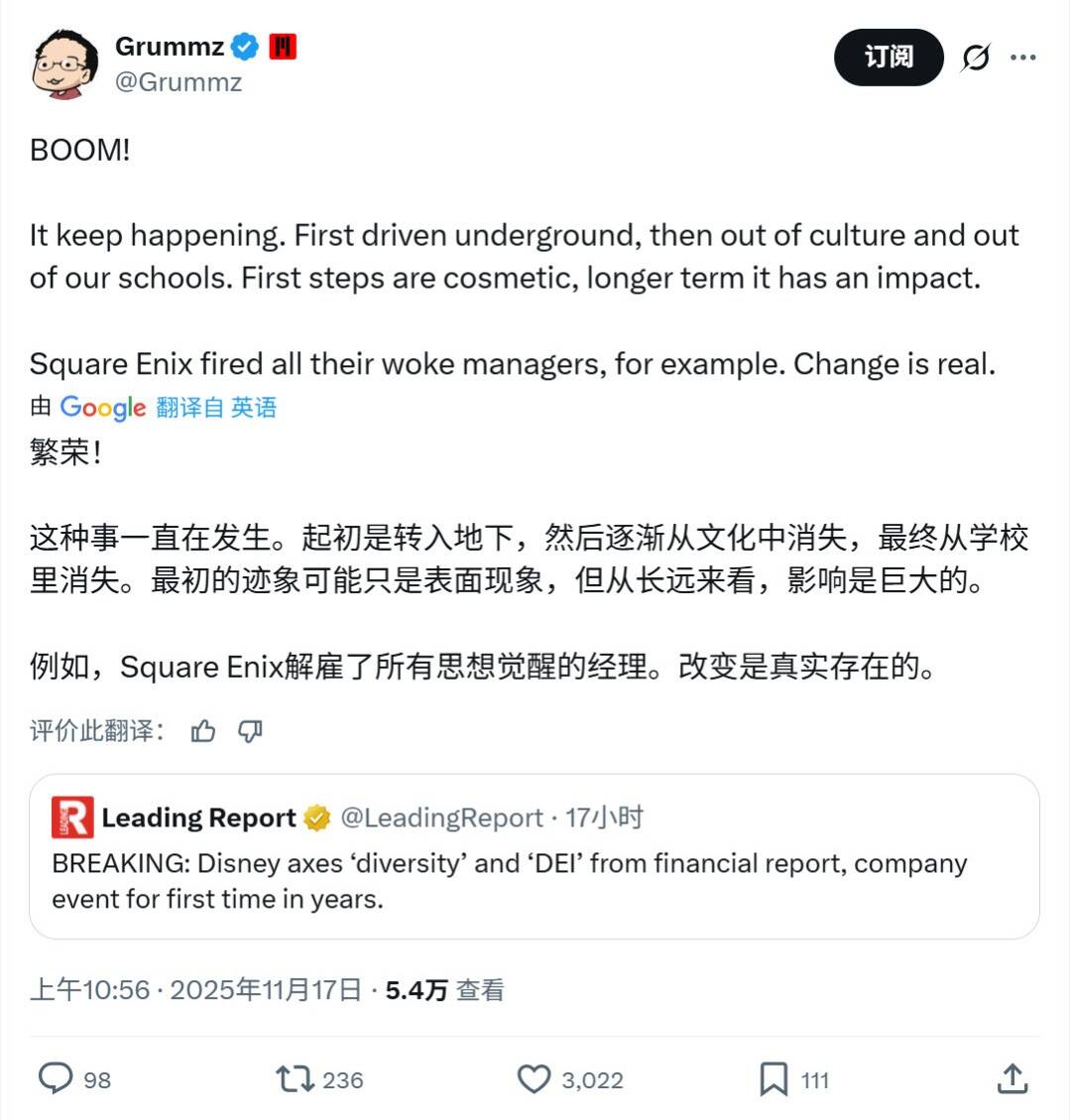 “这种事一直在发生。起初是转入地下,然后逐渐从文化中消失,最终从学校里消失。最初的迹象可能只是表面现象,但从长远来看,影响是巨大的。 例如,Square Enix解雇了所有思想觉醒的经理。改变是真实存在的。”