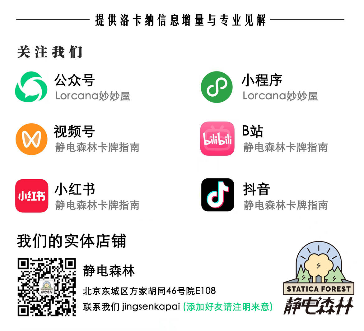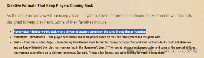 官网在最近一篇介绍纽约店家The Uncommons的文章中介绍了他们为洛卡纳玩家准备的游戏体验,提到了对于新玩法的尝试,其中有一个“电影大作战”指的是玩家使用双色套牌,但所有的角色都来自于同一部电影或IP,其实就很类似我们之前提倡的“起源”赛制,只不过我们考虑到目前卡池还不是很深,建议的是两个IP搭配。