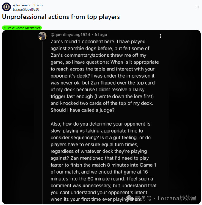 最后还有一个偏花边的新闻那就是密尔沃基参赛选手抱怨Zan Syed在和他对局的时候表现不够专业,在时间正好的情况下催促玩家加快操作,并且还擅自“帮助”对手触发自己的黛丝奇能,翻对手的牌库顶,导致额外的牌张从牌库顶被翻开。