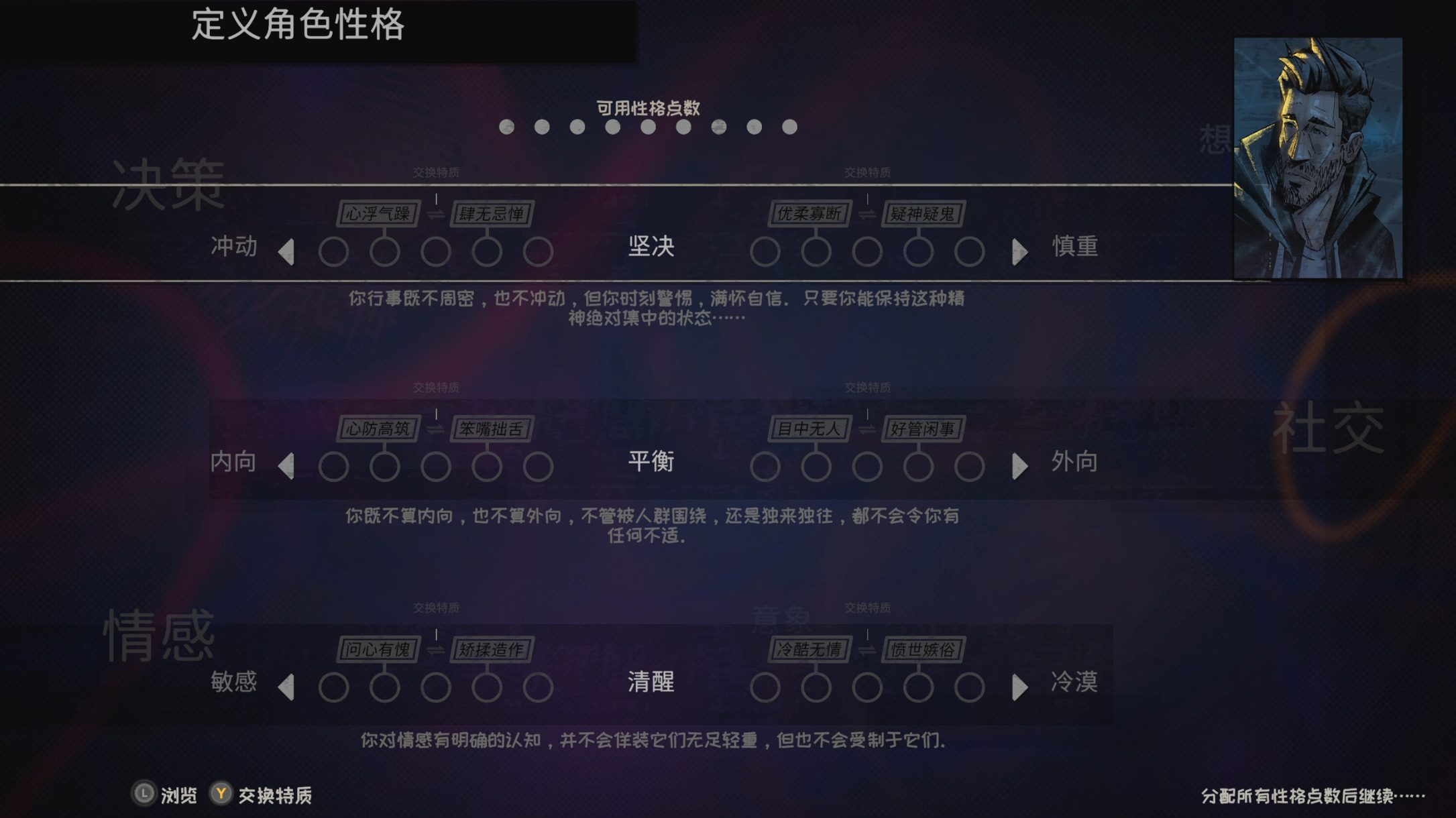 作为一个以选择与角色扮演的游戏,玩家能够在游戏开始时自定义自己的主角性格,行事风格是冲动还是慎重,对人是内向还是外向,与他人交际是敏感还是冷漠。每位玩家都可以扮演一个符合自己心意的主角,而角色性格的特质会在游戏之中解锁和锁定某些特殊对话,让游戏更加有代入感。