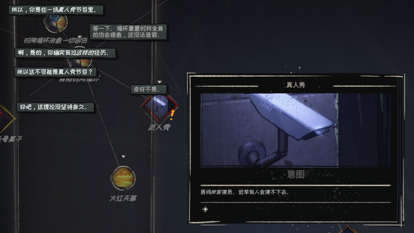 在每个循环中,玩家都会找到更多的信息,而这些信息都会成为记忆记录在哈洛先生的思维图之中。特定的记忆会自动组合成一些意图。花费从探索中获得的灵感或是永久的意志力便能让意图开始实践,而意图能解锁更多的场景互动与对话。但即便哈洛可以无限次的重来,也无法实现自己的所有意图。但意图失败并不是结束,而有机会解锁更多的意图和事件。