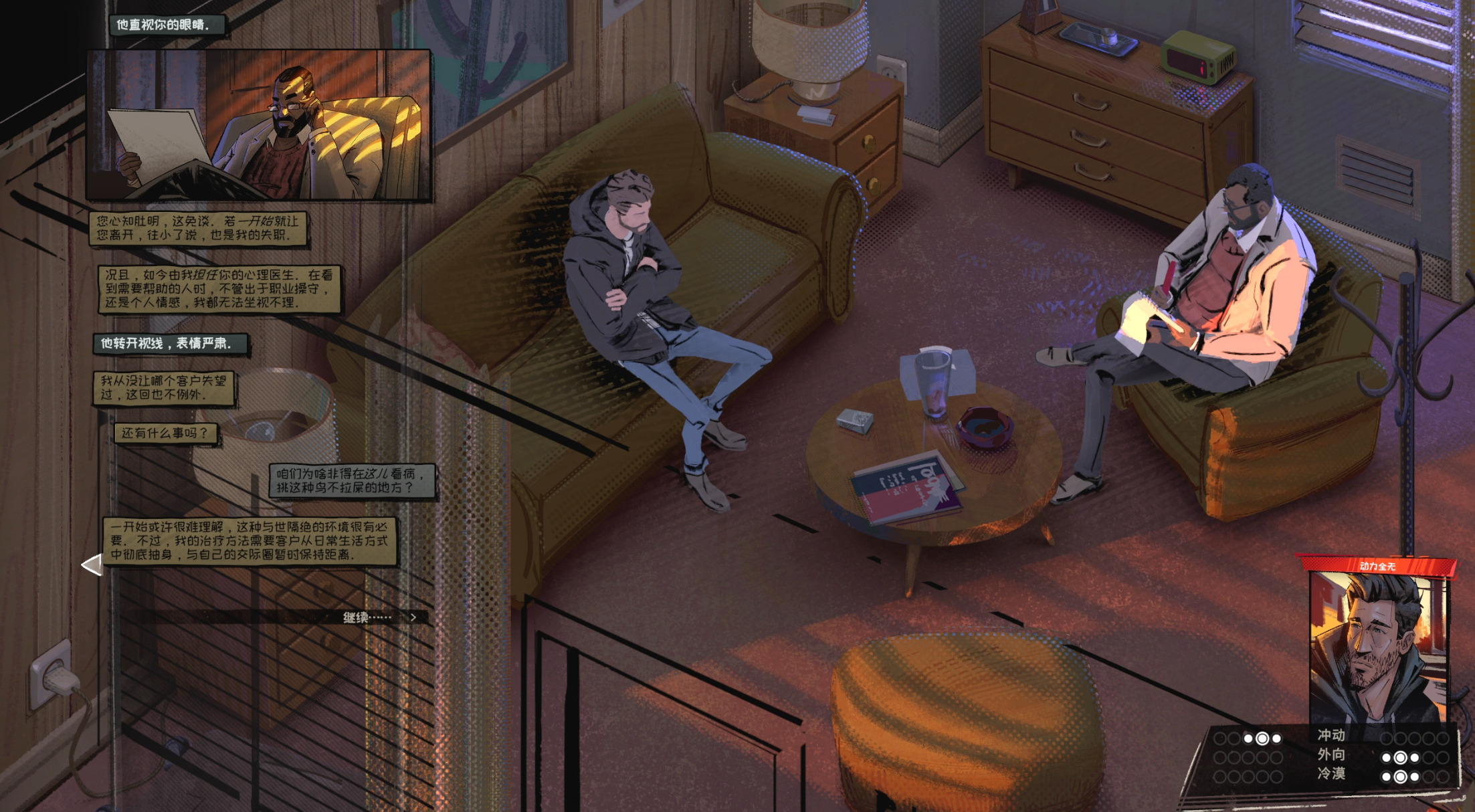 咳咳,好了。让我们跳过剧透的部分,来聊聊剧情以外的东西。想必热衷于剧情抉择游戏的玩家对于《极乐迪斯科(Disco Elysium)》并不陌生。《懊悔谷》从美术风格到游戏用语和翻译,都有这位前辈的影子。但相较于迪斯科的厚重,《懊悔谷》采用了更为明快的美式漫画风格。并且将存在运气成分的骰子检定,修改为了对性格的固定判定,避免了因运气的反复SL。