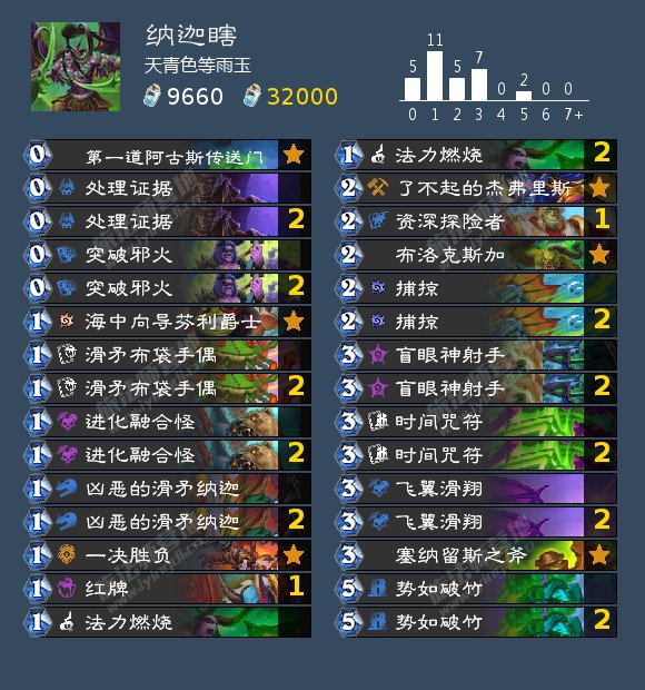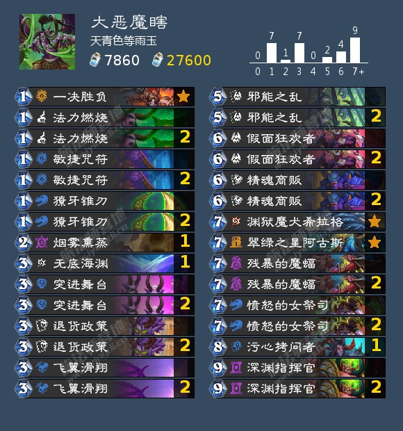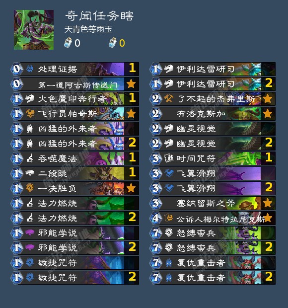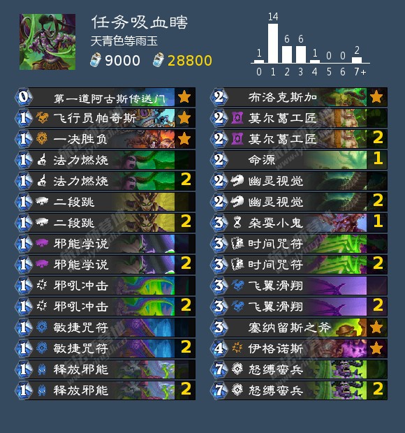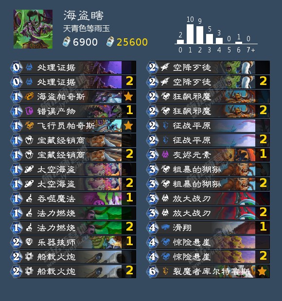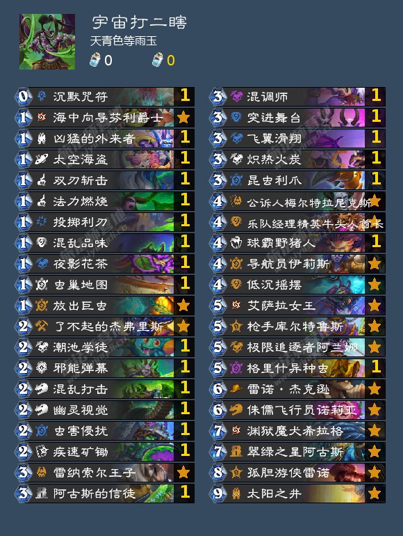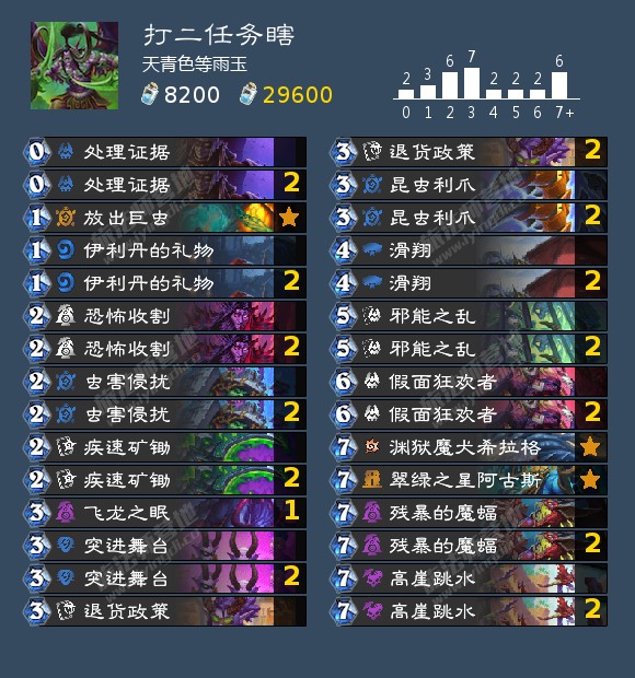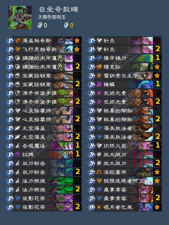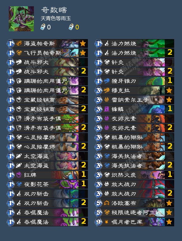 奇数瞎(恶魔猎手基础英雄技能升级后效果为1费,在本回合中获得2点攻击力。)低费进攻技能使得卡组思路必然是进攻思路,这方面与低费海盗很是契合,加上一些相关干扰及对策卡,一套朴实无华的节奏中速卡组就出来了,属于玩具卡组。