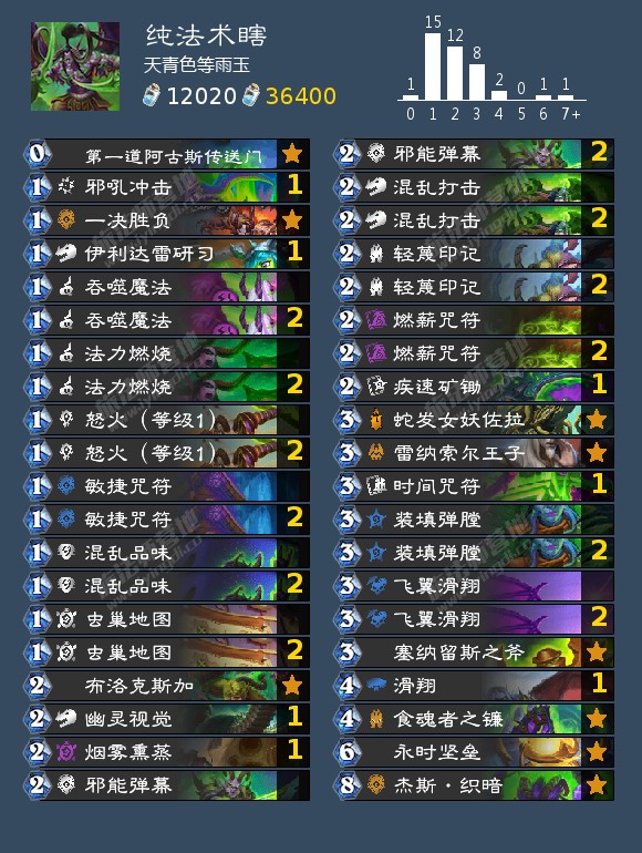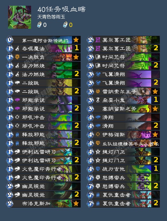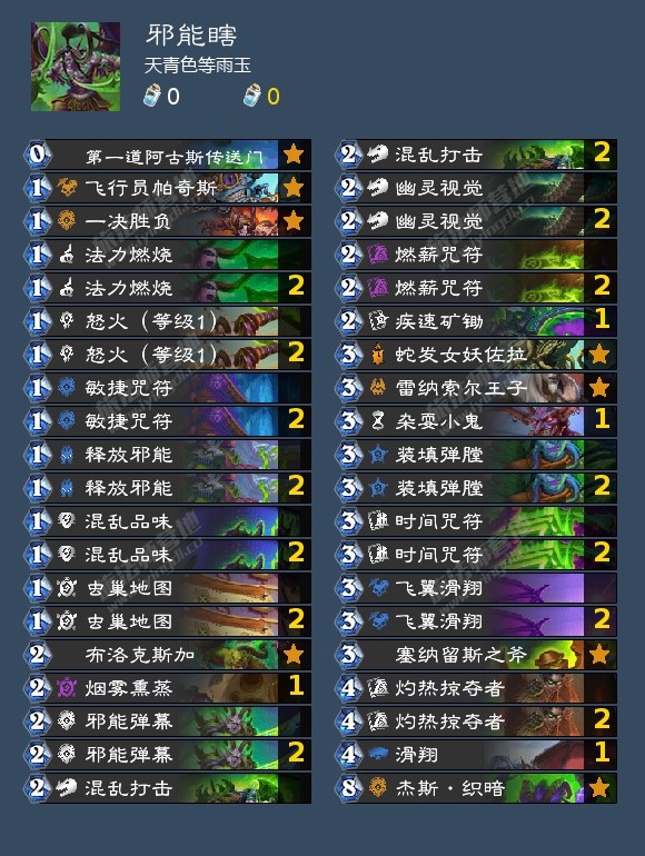 邪能体系有着瞎子唯一导演、暴风城带来的未来可期的优质终端杰斯·织暗,前期投资了大量优质邪能法术的杰斯能够有着很强的终结能力,通过装填弹膛给佐拉减费回收杰斯重复利用的小combo更是神来之笔。笔者个人推荐目前玩纯法术邪能瞎,六费杰斯的上限还是太吃香了,不过这里依然给出一套非纯法术邪能瞎,当然也是一套玩具卡组。