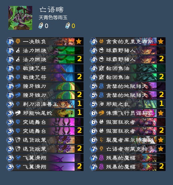 贫瘠之地版本的新体系,主要思路是亡语随从套娃赖场,并用核心卡亡语者布莱克松进行一波超展开。亡语瞎的套娃终端“≤4费的亡语随从”一直在演变,从哀嚎洞穴的邪能响尾蛇,到沉没之城版本的自私的扇贝和纳堡版本的贪食的克里克西斯,最后到现在威兹班工坊版本的球霸野猪人和安戈洛龟途的黏团焦油,卡组强度的进化可见一斑。但目前仍属于玩具卡组。