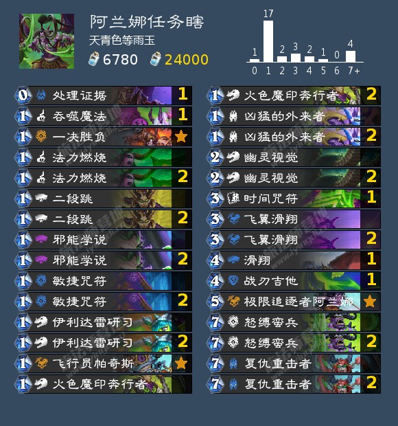 任务奇迹瞎不放入体系卡组的原因是这套卡组融合了低费多频流放获得巨人(复仇重击者)收益,一回合过牌获得巨人(怒缚蛮兵)收益,减费(一决胜负),巨人复制扩大场面(邪能学说),干扰(滑翔法力燃烧公诉人梅尔特拉尼克斯),高爆发(奇闻布洛克斯加,了不起的杰弗里斯,战刃吉他)而达到奇迹卡组的效果,属于来自多个版本多种体系的多张卡最后组合而成的一套非常标准的超展开卡组,是一套天梯的武器卡组极限追逐者阿兰娜。