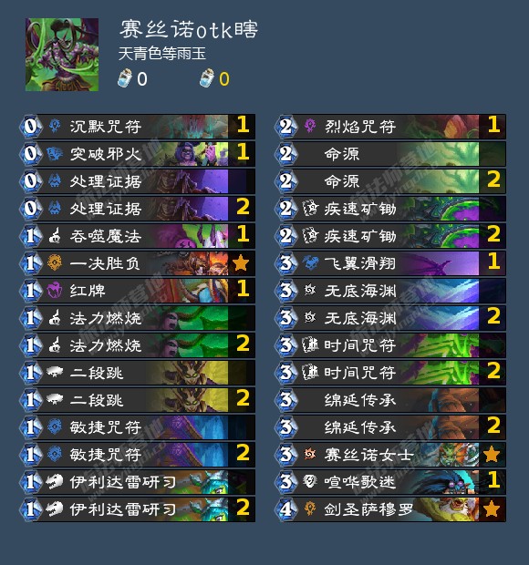 顾名思义,以沉没之城扩展包的恶魔猎手橙卡赛丝诺女士为核心的otk卡组。通过为赛斯诺女士增加攻击力并使用法术重复触发其特效来转化为大量直伤。这套otk曾因马速过快而使赛斯诺被设计师从3/2/4削弱成了3/1/4詹姆斯女士。时间流版本带来一张有条件的强力减费:命源,这张卡极度契合少随从的otk构筑如吸血瞎赛丝诺otk瞎等,补一张额外的随机随从还可以防剑圣脏鼠异议等破坏。