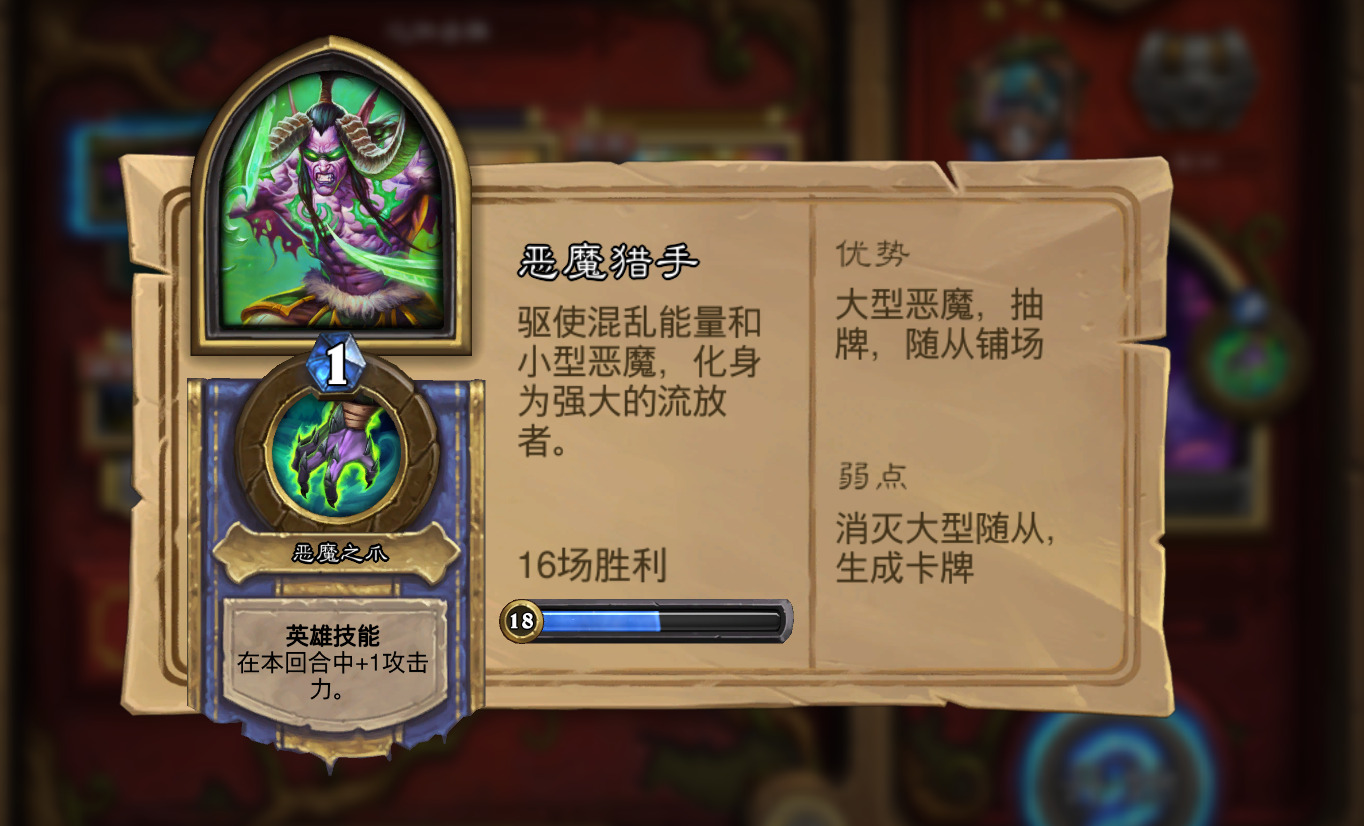恶魔猎手,俗称瞎子。在所有老玩家都坚信暴雪不会推出新职业的时代,加入了炉石传说。