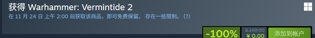Steam喜加一来了!现可再次限时领取第一人称合作游戏《战锤:末世鼠疫2(Warhammer: Vermintide 2)》,原价108元。此前Steam曾送过这款游戏。
