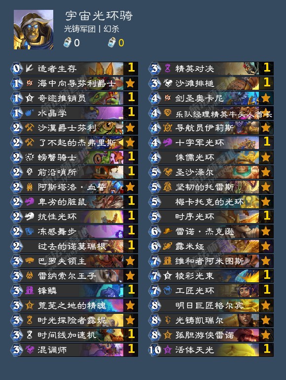 个人认为宇宙骑是必须要携带3攻刀的,而且这套卡组还是需要前期有一定节奏。沙滩排槌应该是当前综合能力最强的圣骑士3攻刀,提供一定的补刀和补费能力,与螃蟹骑士和圣沙泽尔都能配合
