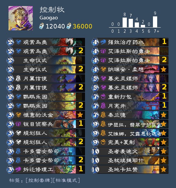 我想,经常玩控制牧的朋友都知道,为了在这套笨重的卡牌里携带伊莉丝,我们往往要凑几张0和1。但是!伊莉丝真的非带不可吗?在这套牌里,我舍弃了伊莉丝!!!这样,我就不用带引力失效、月影花茶、鲍勃、空宇等等废牌,转而带一些不错的质量牌。我觉得这个思路也许是对的?反正,我上传了。卡组如下: