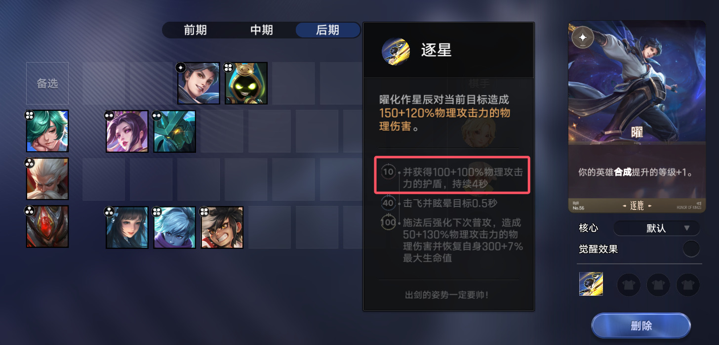 效果牌和天赋牌的选择上,两张逐鹿牌>两张牌>一张牌。效果牌和商店遇到提升英雄等级的卡,基本都可以考虑拿了给曜,前中期还是以先拿核心和觉醒为主,都觉醒了,就开始想办法刷等级。
