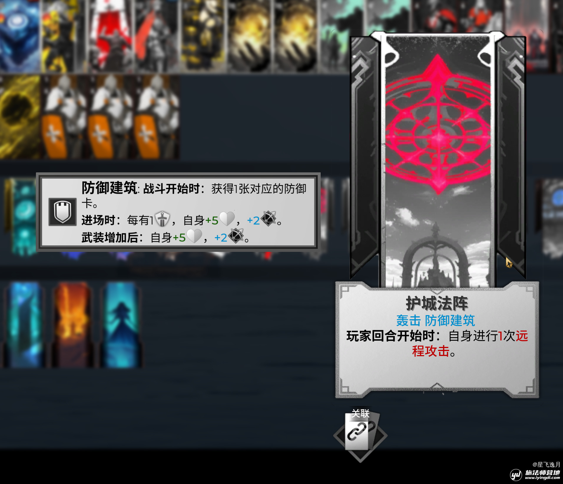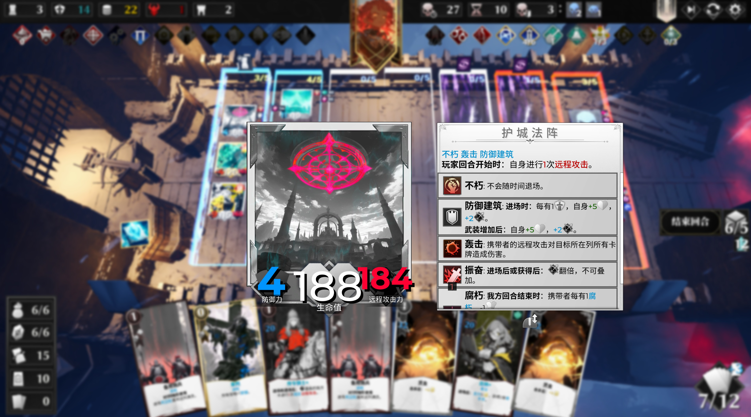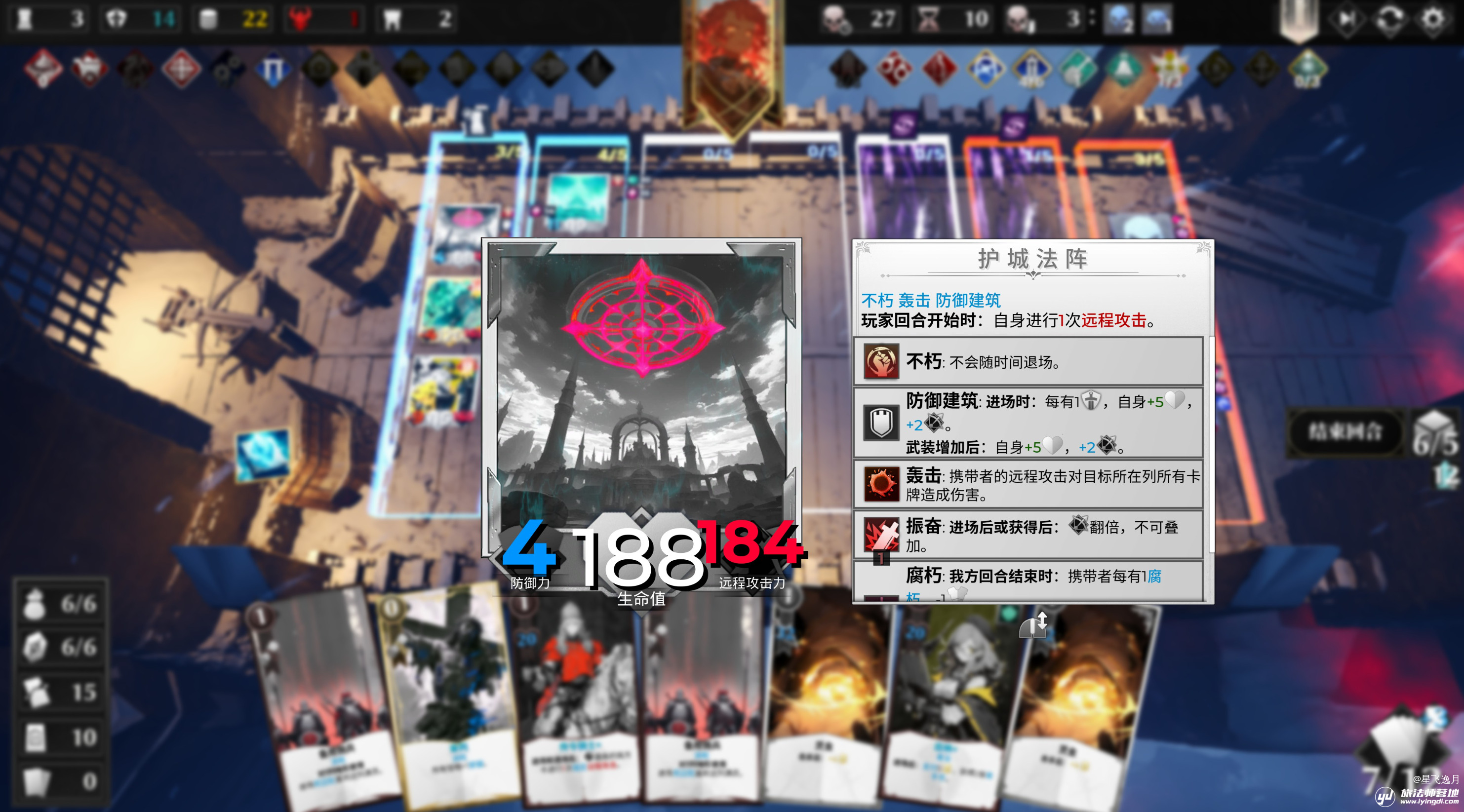 核心输出点为护城法阵,自带的轰击属性能同时对一列的敌人进行群体伤害,再通过叠武装或者用挑衅增加单次伤害,使用金手币增加攻击频率,前排则由长矛兵和备用佣兵生成的死囚犯阻挡敌人前进,在中后期杂兵密度较高时能起到非常好的压制效果,少数敌人(比如龙和不可名状之尸)会需要一点耐心,基本上成型之后能应对大部分战斗。