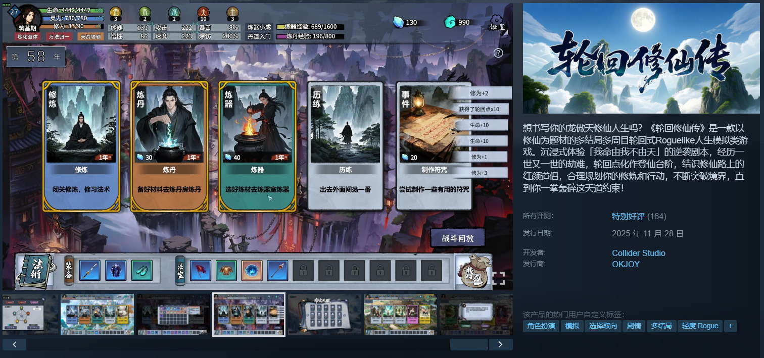 - 本作主打轮回式多周目,并且游戏含有超过10个主线结局和双修结局、多个流派以及困难模式,整体游戏时长在6-10个小时以上,大家可以自由选择天赋、搭配技能和法宝,尝试不一样的流派、人生和结局。
