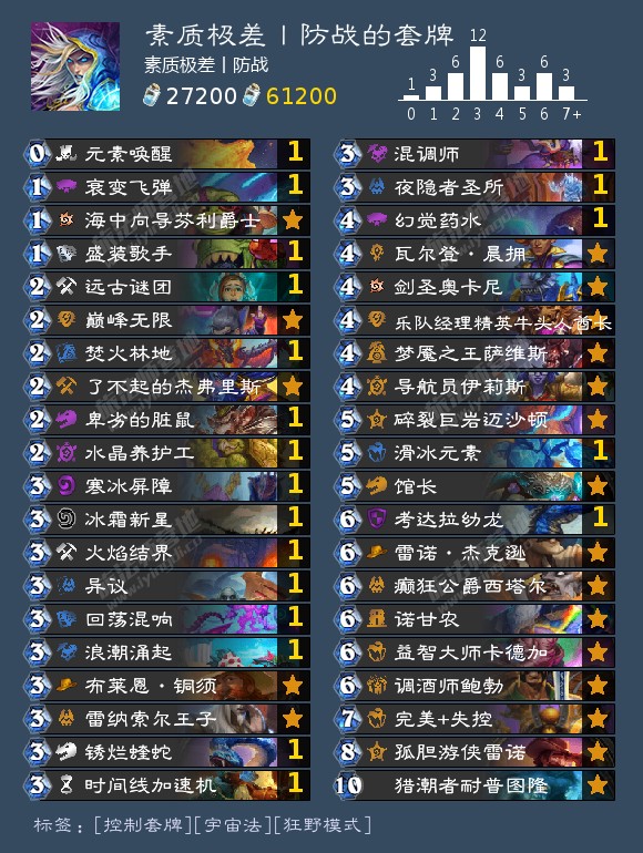 安利一套纯控制法,这两个月一直在高分段玩这套牌,目前月初16名,直接从铂金9到传说16名打了个23连胜,可以说是非常适合现在狂野的环境。这套牌我2个号打了几百场对局,可以变的卡位应该只有两个:水晶养护工,卡德加不建议带锋鳞,因为会影响馆长稳定检索考达拉。带3费吃刀的是因为高贵的野兽属性,刚好4费配合馆长多过一张。耐普图隆的是10费曲线,另外后手胡的情况下可以3费元劈,45费连拍耐普图隆。(经常有人打法师2费直接脏鼠....)这套牌和龟法不一样,是不能让场面的,可以当成一个有冰箱的宇暗,以节奏为主。基本上优开一切快攻,一切德鲁伊系otk,光速,奇迹贼和各种宇宙五五开 赢点就是考达拉幼龙+奥术枪弹,或者场面推死。泰坦和伊利斯很多时候可以偷鸡。大劣任务术(亲爹)30猪小劣40猪,宇宙大野兽猎,任务瞎,带换家的德。