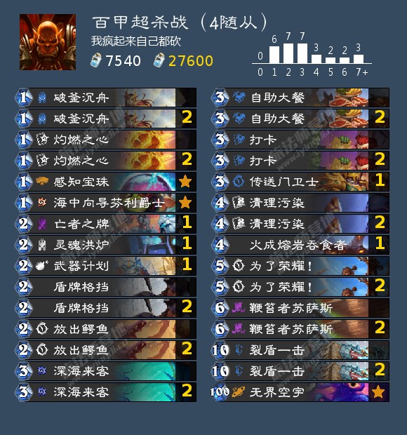 经过大量实战,黑石百甲冲锋战,真很不错!真心推荐给大家!另外超杀战还是可以玩的,这里推荐本文结尾的百甲超杀战。虽然当前超杀战还是很艰难。补丁回调了假卡放出鳄鱼,大地裂变也没什么好卡补强超杀,但是超杀之神永存我心!