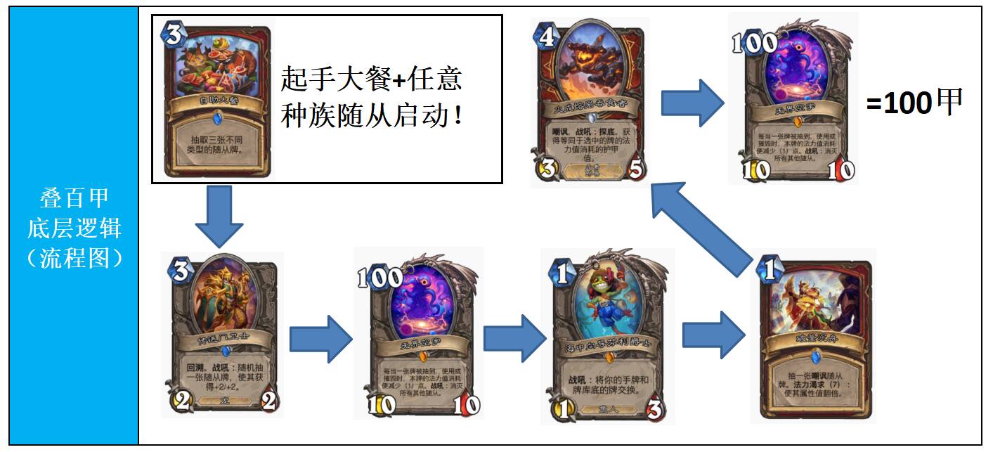 起手必留大餐(无论任何对局,叠百甲的核心!!!),有大餐的情况下可以选择留一个随从(尽量不留空宇,后手可以考虑,但是最好在手牌右侧,大餐过后传送门卫士找芬利,再把空宇带下去),没有随从的情况可以看情况留破釜沉舟,这样配合大餐一样可以叠百甲,只是说降低了5费百甲的概率,非特殊情况不留破釜沉舟!