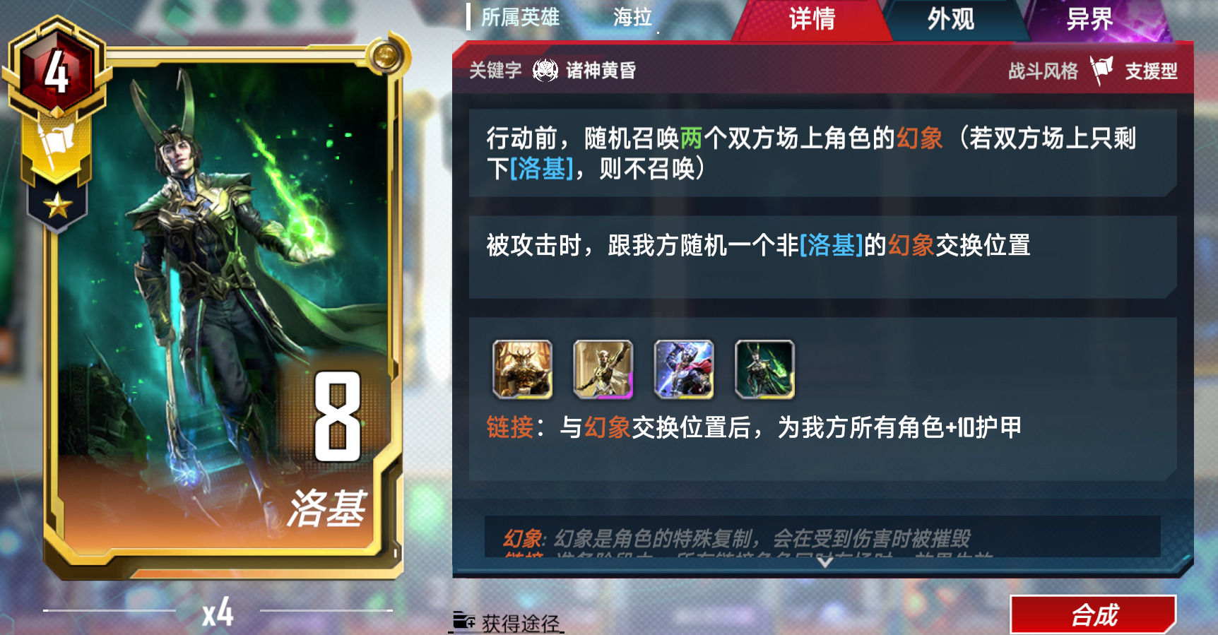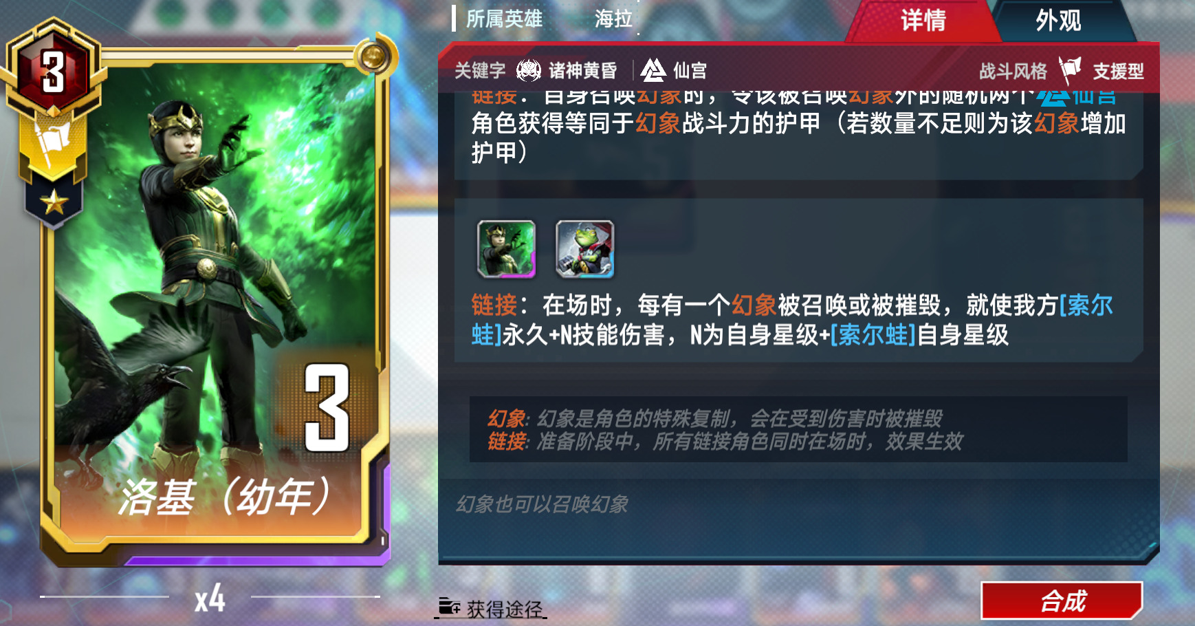 小洛基链接(索尔蛙)效果:在场时每有一个幻象被召唤或摧毁,就让索尔蛙永久加小洛基星级+索尔蛙星级的伤害。