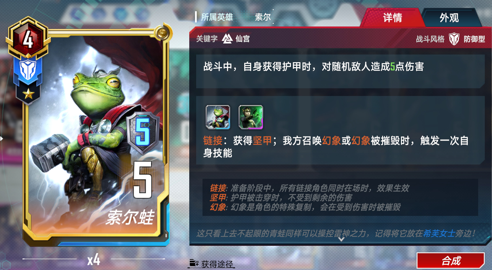 索尔蛙 链接(小洛基 )效果:获得坚甲;我方召唤幻象或幻象被摧毁,触发一次自身技能伤害。(伤害爆炸!牛!)
