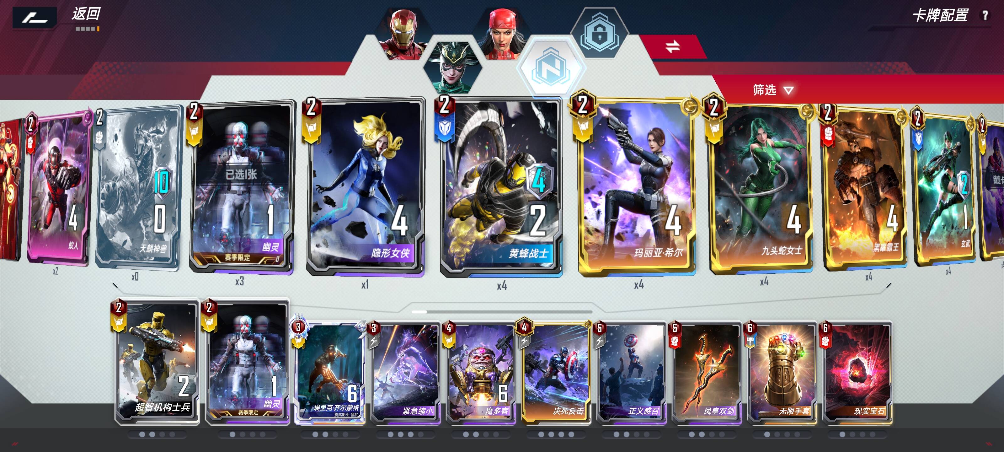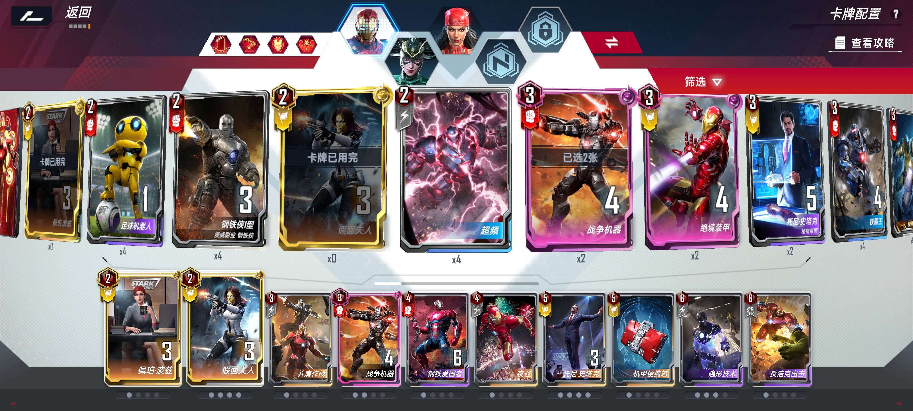 四费:打工爱国者经济最大化,有时说不定还能刷出个四费钢铁侠好卖钱;夜巡可以多带几张,后面既可以稳定胜率把不好打的牌换掉,也可以给托尼用后面两回合后又刷一波经济