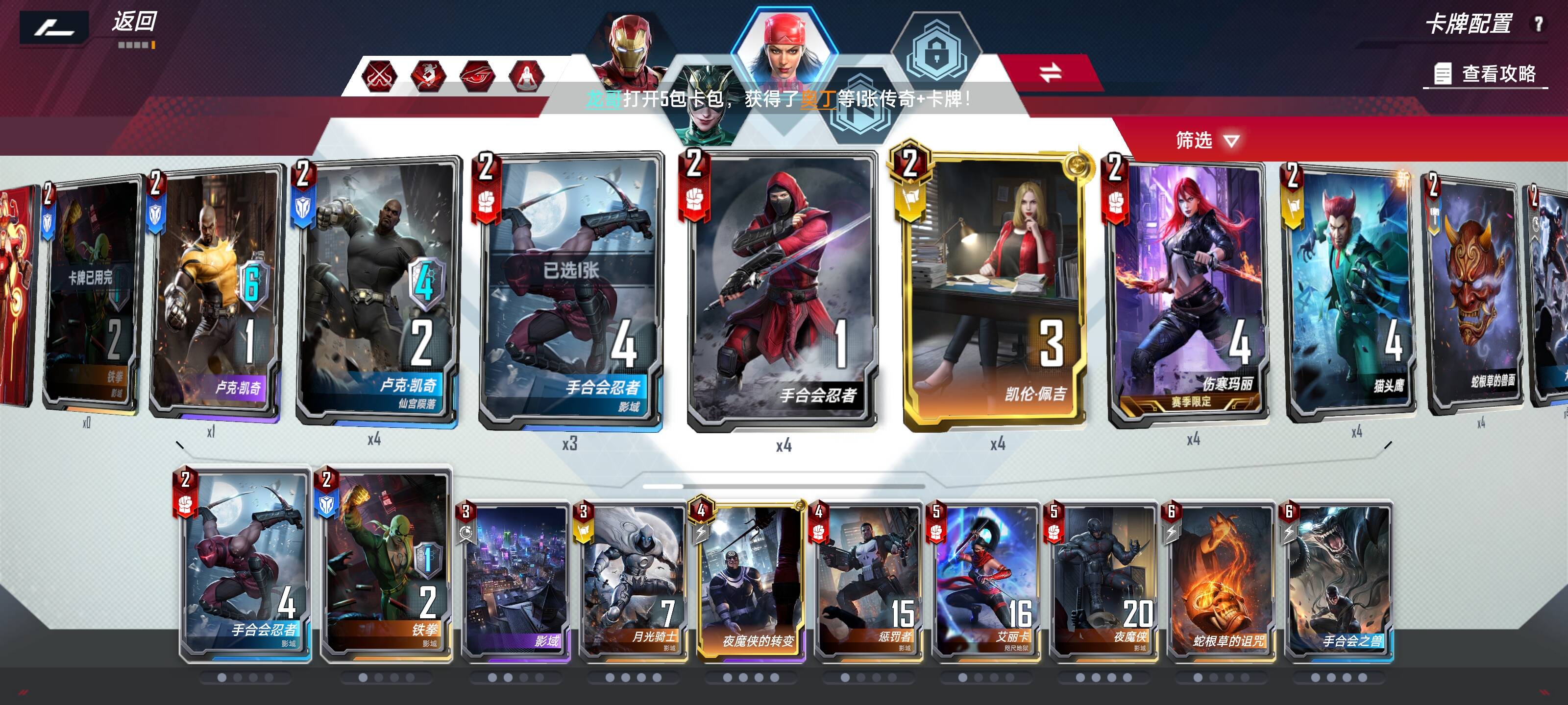 场上3星月骑回合结束手里留1张面具,下回合4面具月骑碰四,不用在商店买面具刚好够10兽化,碰四的聚会开到蛇根草就能秒杀25血。 - 6回合后重点找夜魔侠,刷钱找到夜魔侠的转变再开始兽化,找托尼等配件赚钱,多整点面具在找到夜魔侠之后,打出夜魔侠的转变之后免费滤牌,惩罚者也要上至少一张,塞点面具,省的后面支撑无力,这套用面具刷新找牌很快确保每回合最后要扣一张面具下来,带给夜魔侠用来稳血。刷到转变也要买一张,方便下次继续刷牌,中途也可以凑海拉和狼方便直接转型