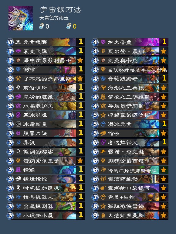 此卡组只作为提供纯银河的思路模板,目前不建议游玩,不带法夜欺诈者的原因是检索的银河有百分之八十的对局都打不出去,所以不如去碰巧去开,就和满月牧的艾维娜,艾露恩钦选者一样。