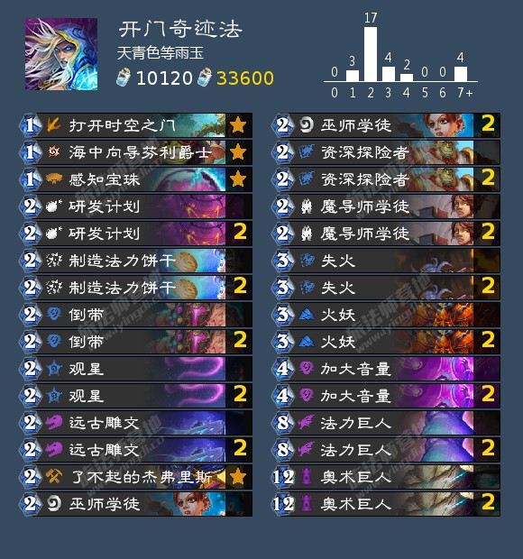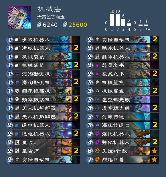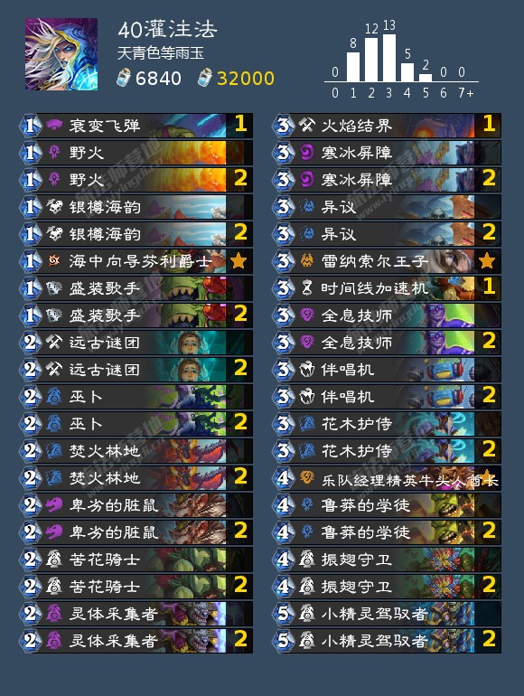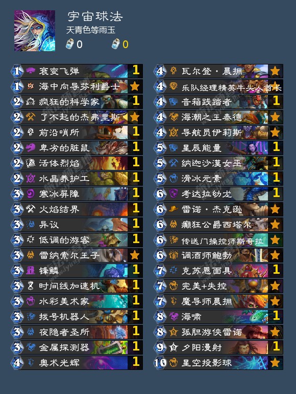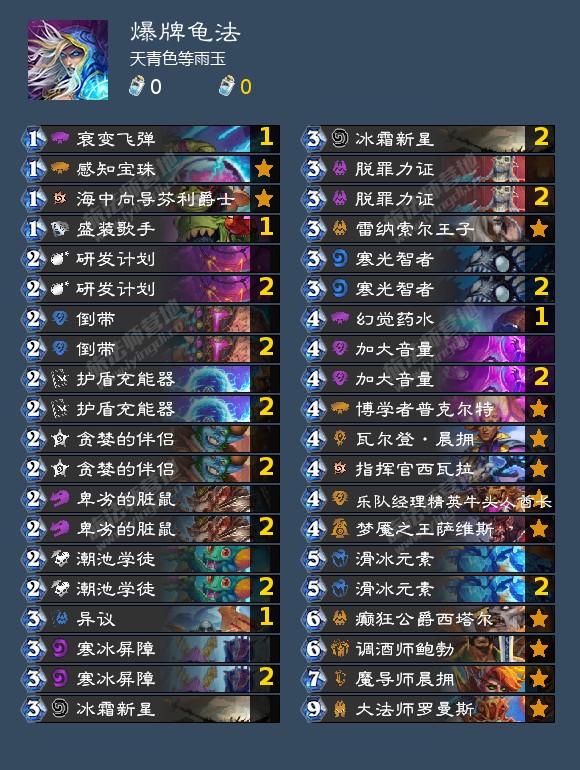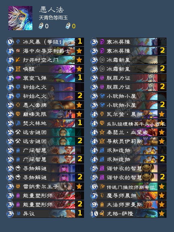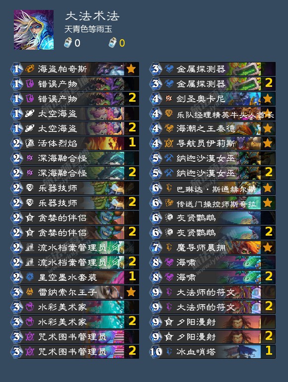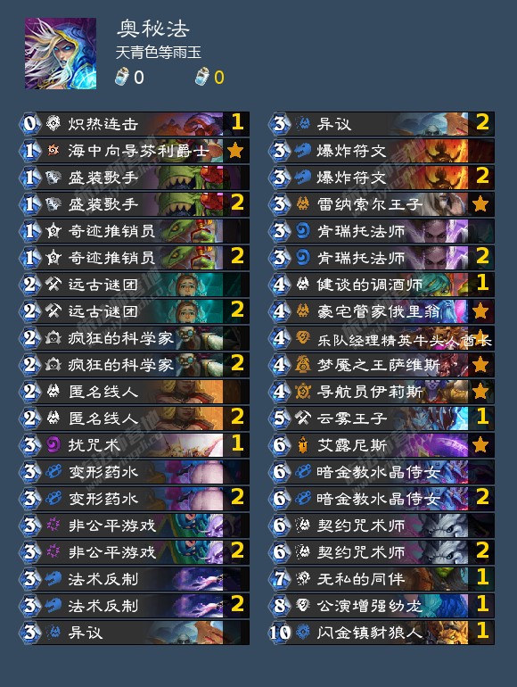 单体系没有任何可用输出思路的卡组,始于外域的灰烬,在贫瘠之地版本收获了体系外卡组也能吃到大量收益的泉水,在威兹班补强了减费过牌解场和幽默的节奏随机终端,不过在胜地收获了法师本家饮料(银樽海韵)以后和暴风城任务线(巫师的计策)配合良好。目前饮料的削弱直接导致任何纯法卡组思路均难以成立,现阶段不建议尝试以下提供的卡组,期待回调。目前属于玩具卡组。