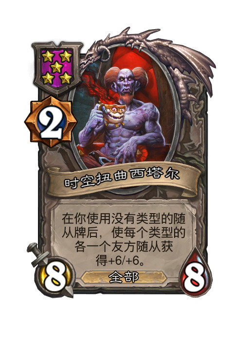 - 新:在你使用没有类型的随从牌后,使每个类型的各一个友方随从获得+6/+6。